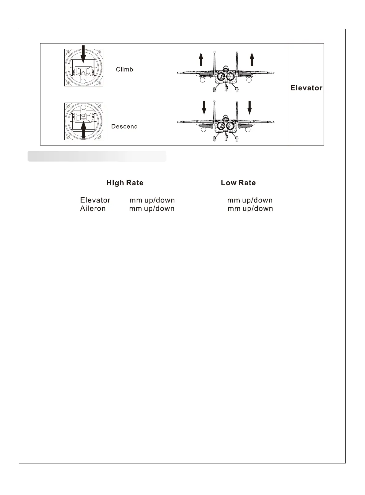 Tips: On first flight, fly the model in low rate. The first time you use high rates, be sure to fly at low to medium