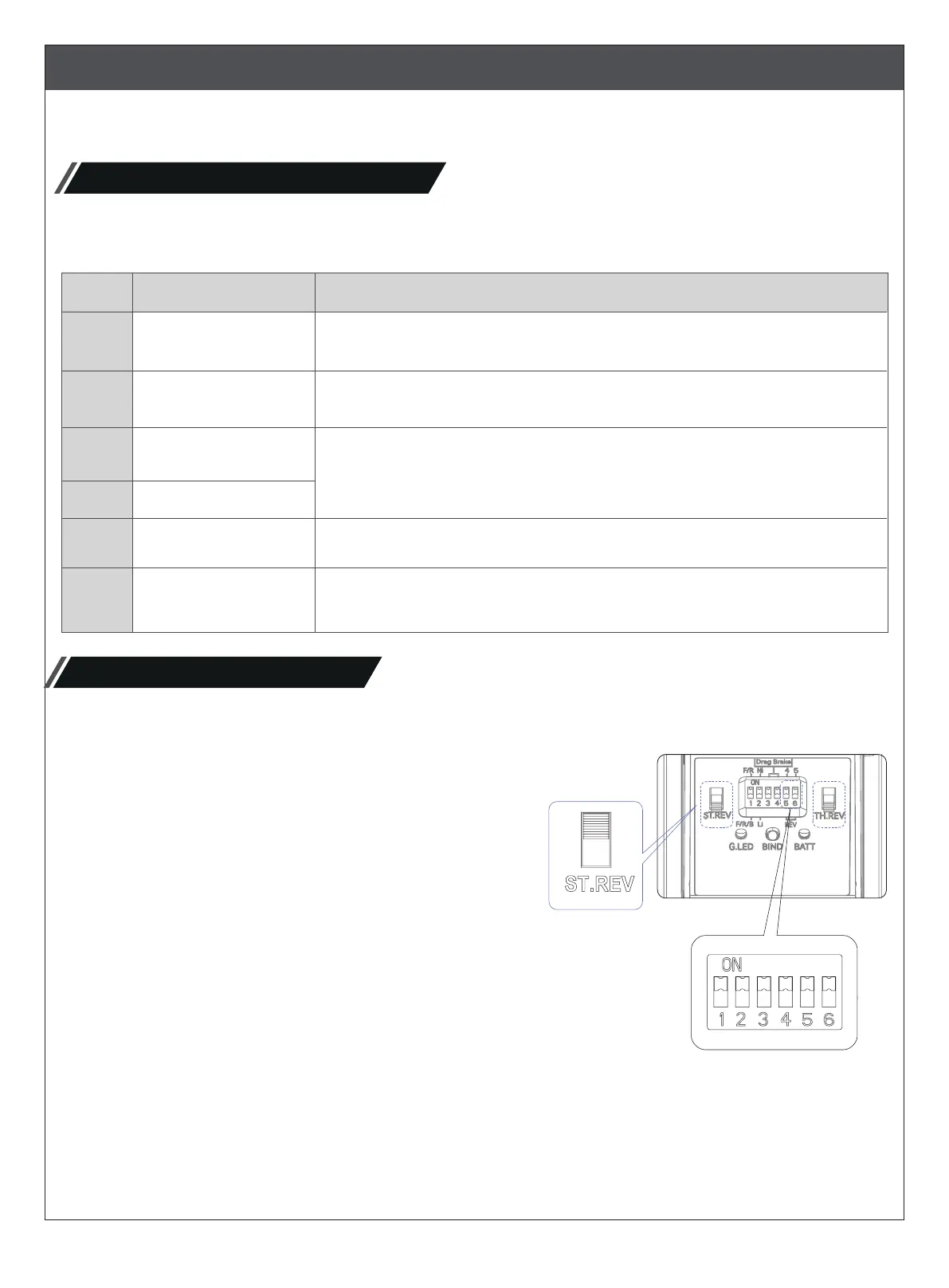 ST.REV 开关和 TH.REV 开关分别为方向通道、油门通道反向设置开关。六