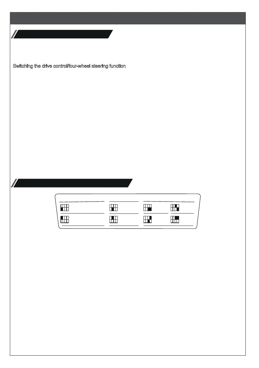 发射机正常开机状态下,同时短按 BIND 按键和 CH4 按键,即可切换驱动控制模式和四轮转向模式,默认驱动