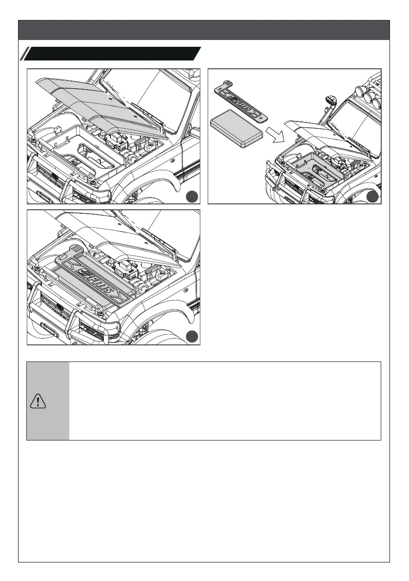 如图所示,打开引擎盖,将电池放入电池舱并使用绑