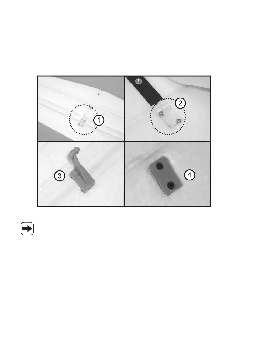Plaats hiervoor de roerhoorns bij de roerkleppen van de vleugels (op de onderzijde van de roerkleppen)