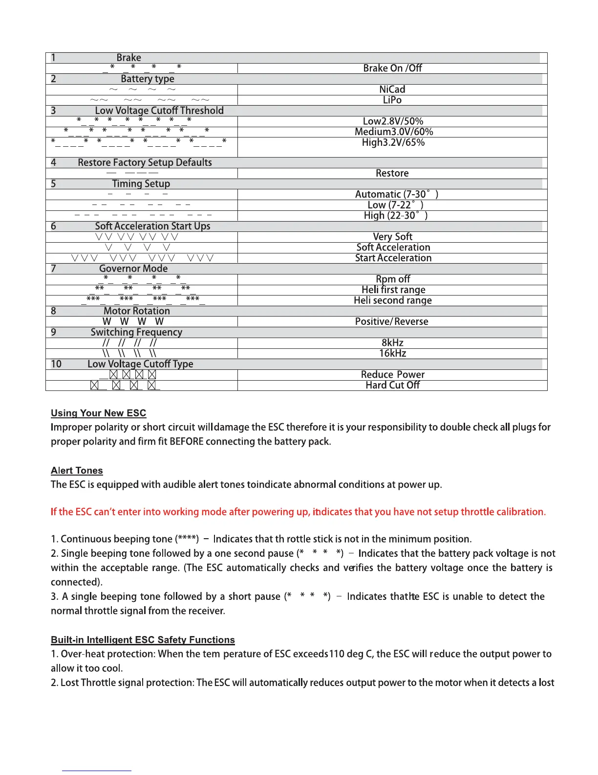 FMS J-3 Cub - ESC Programming Summary; Parameter Configuration Table