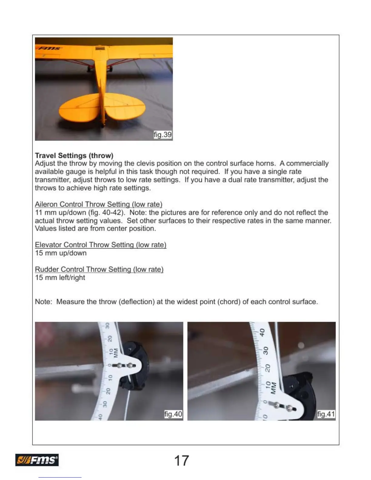 FMS J-3 - Control Surface Travel Settings; Aileron Control Throw Setting; Elevator and Rudder Throw Settings