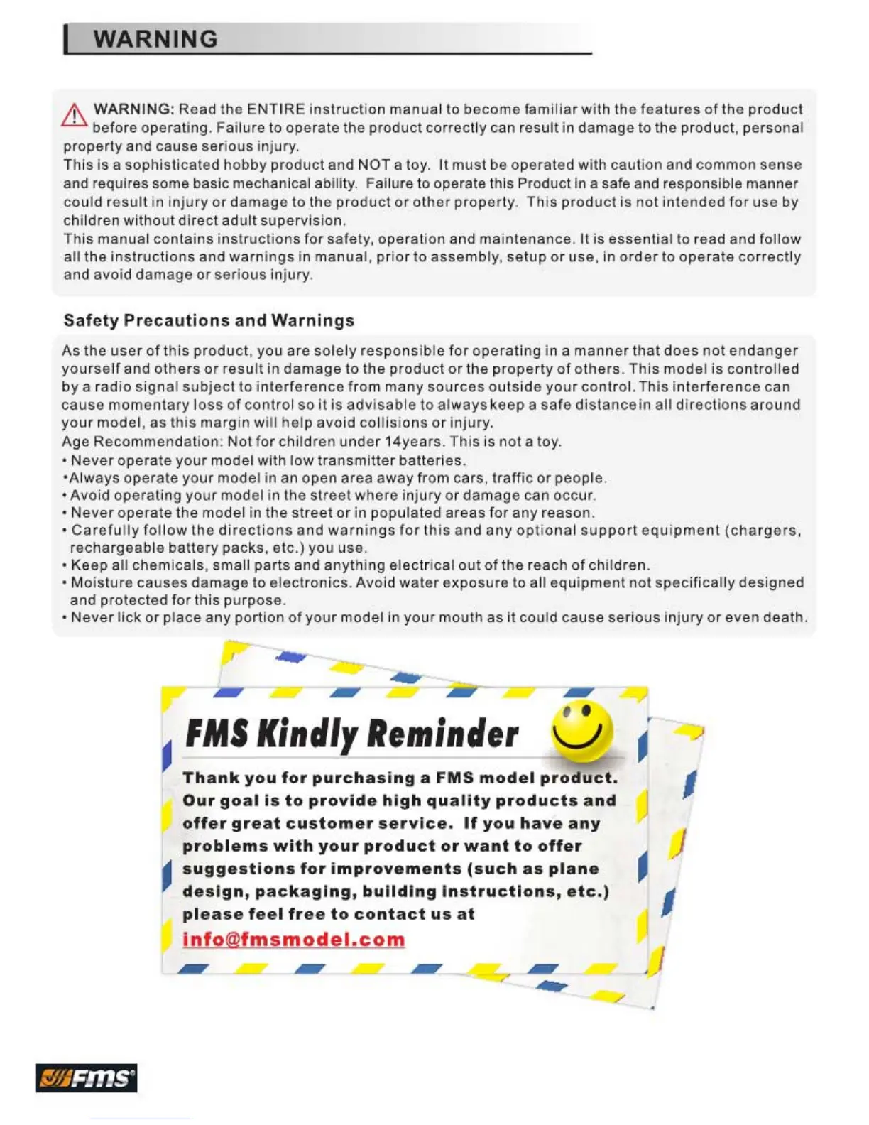 FMS J-3 - Safety Warnings and Precautions; General Operation Warning; Specific Safety Advice
