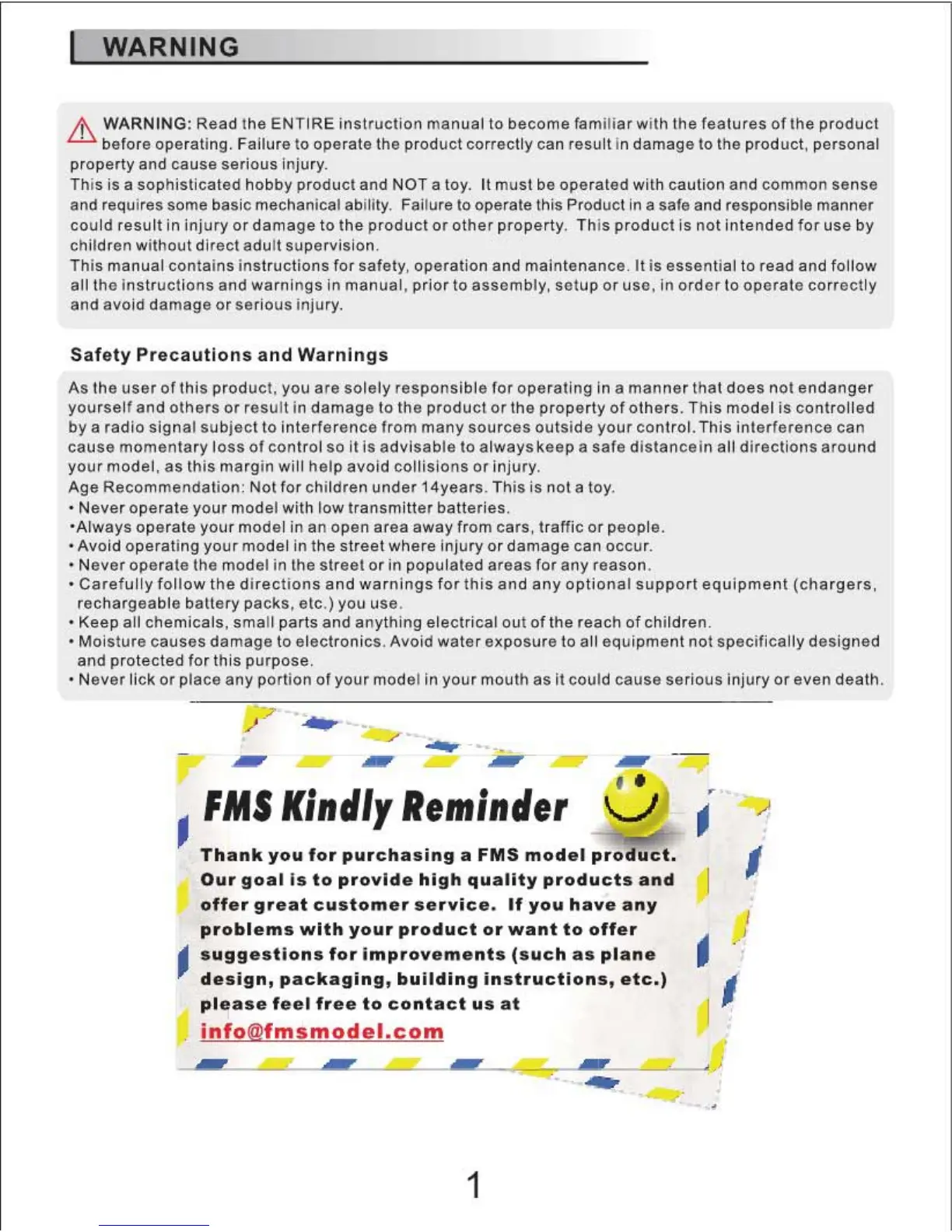 FMS P-40B flying tiger - Warnings and Safety; Safety Precautions and Warnings; FMS Kindly Reminder
