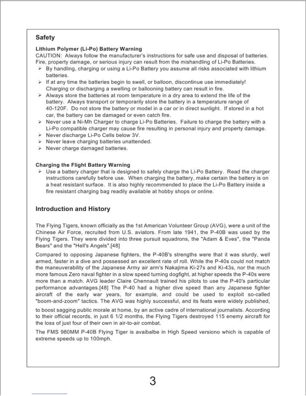 FMS P-40B flying tiger - Safety; Lithium Polymer (Li-Po) Battery Warning; Charging the Flight Battery Warning; Introduction and History