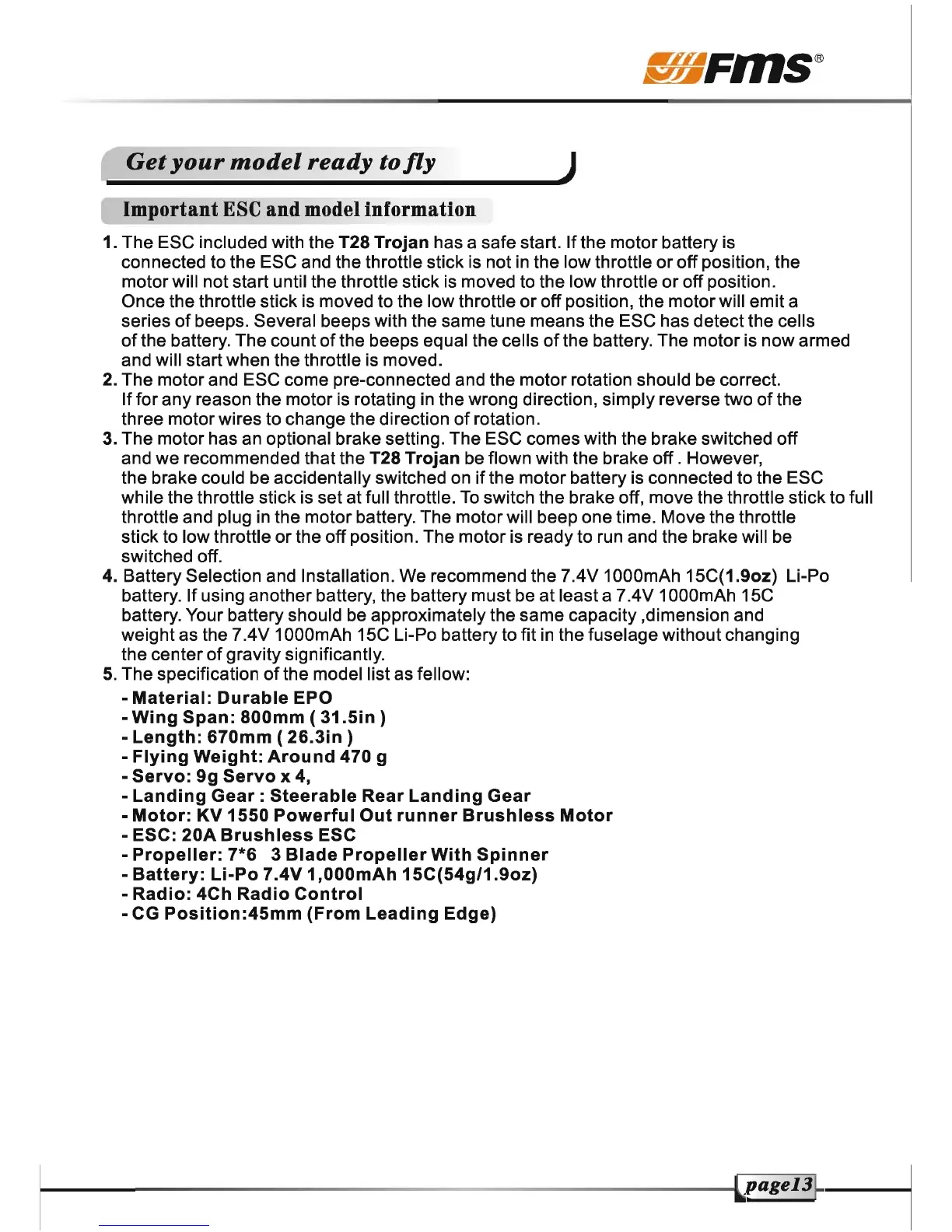FMS T28 Trojan - ESC and Model Specifications