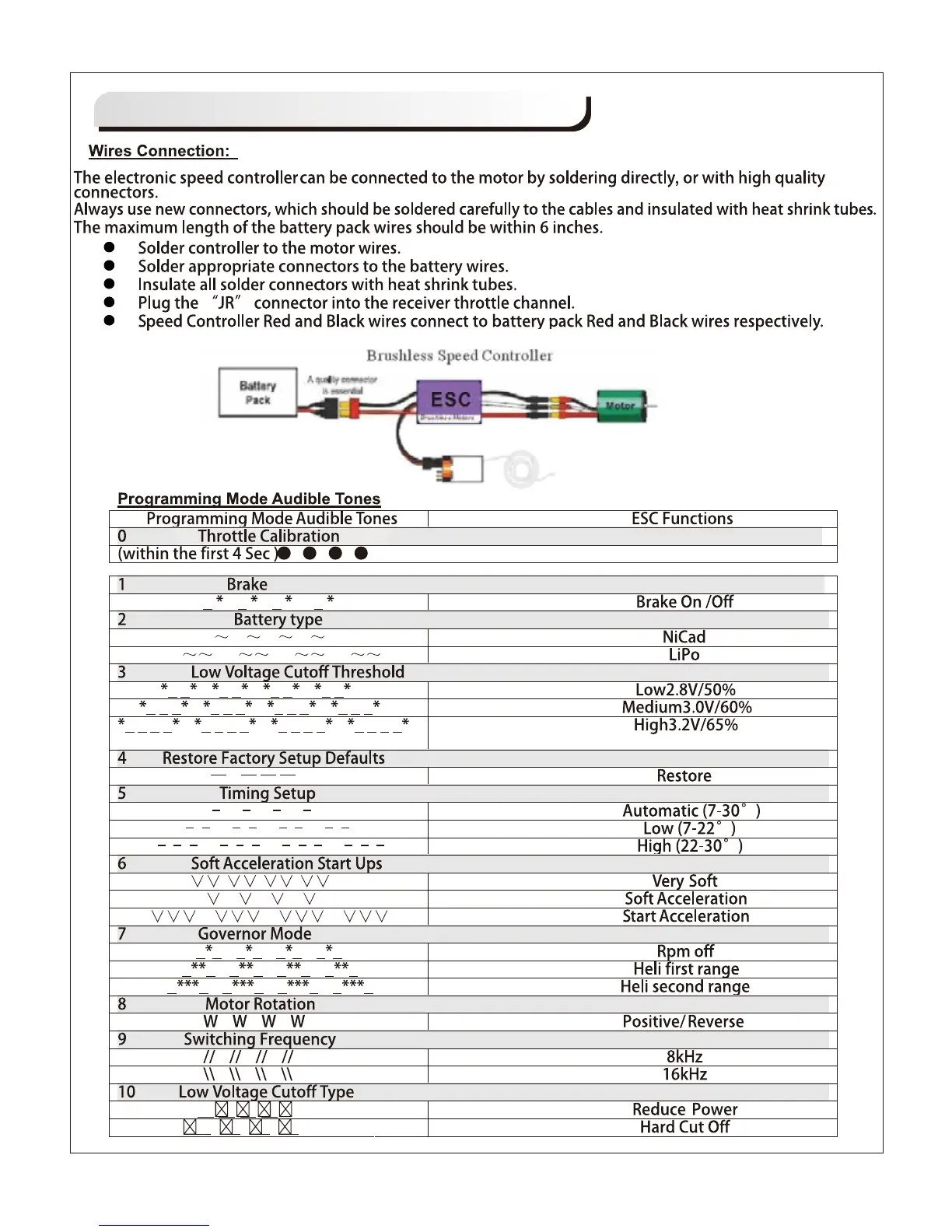 FMS YAK-130 - ESC Configuration; ESC Wiring; Programming Mode Tones; ESC Function Settings