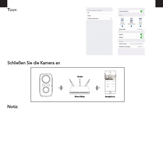 ·Stellen Sie die Kamera und das Smartphone I 30 bis 100 cm vom Router entfernt auf, um