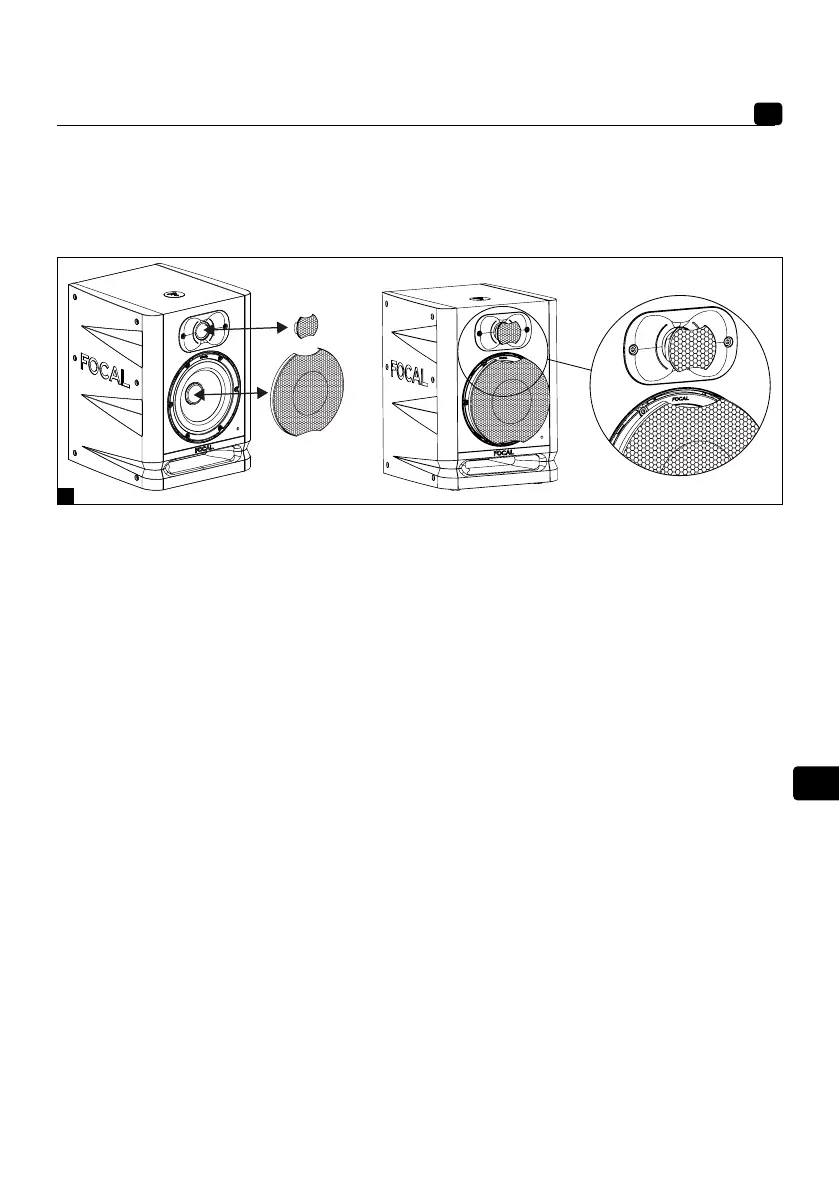 高音扬声器或低音扬声器。必要时可使用塑料物件轻轻撬动。要插入格栅,请将格栅的槽口放在专用孔位前并逐一按下(图I)。
