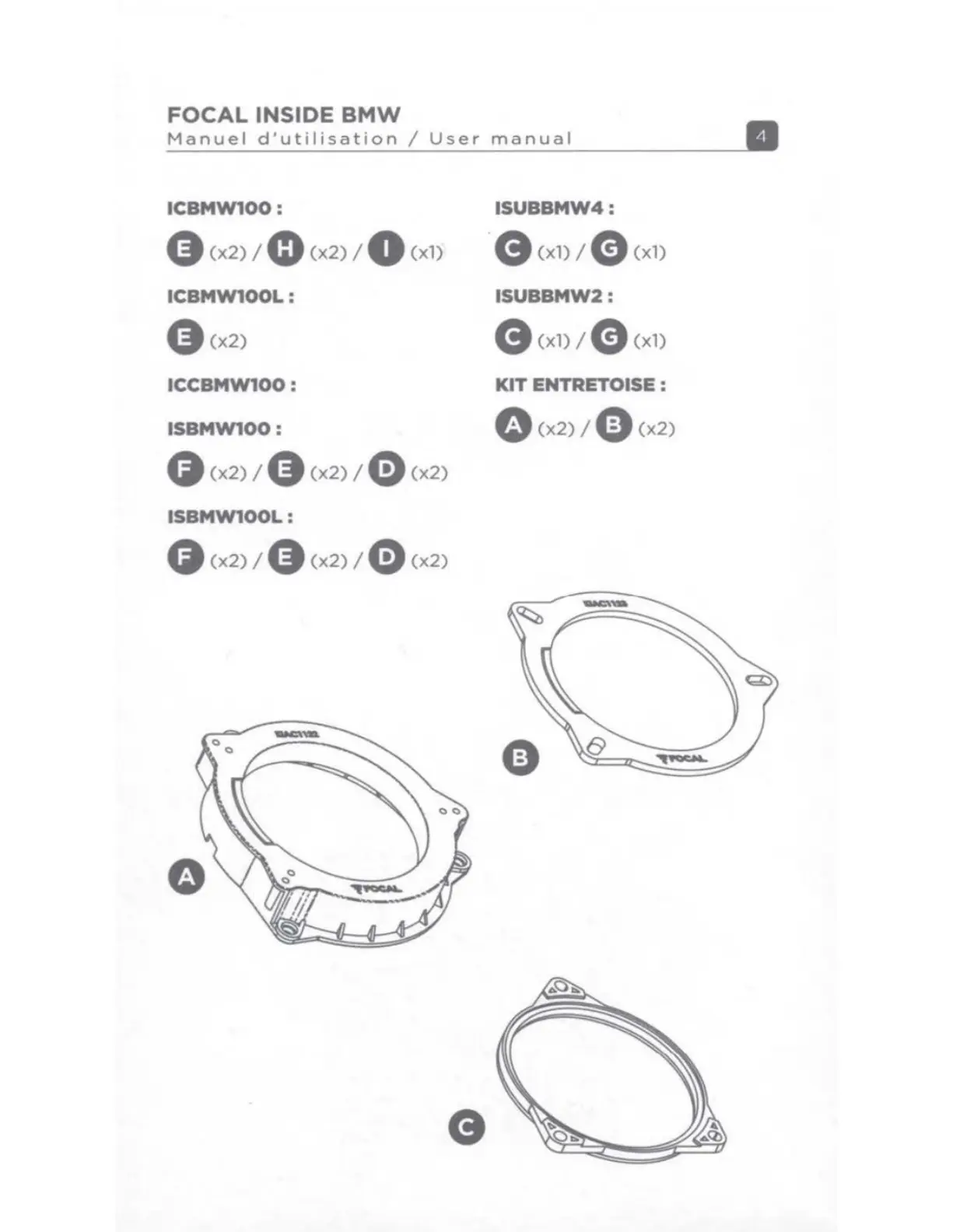 Focal IC BMW 100 - Product Components Overview; Component A & B: Spacers; Component C: Adapter Ring
