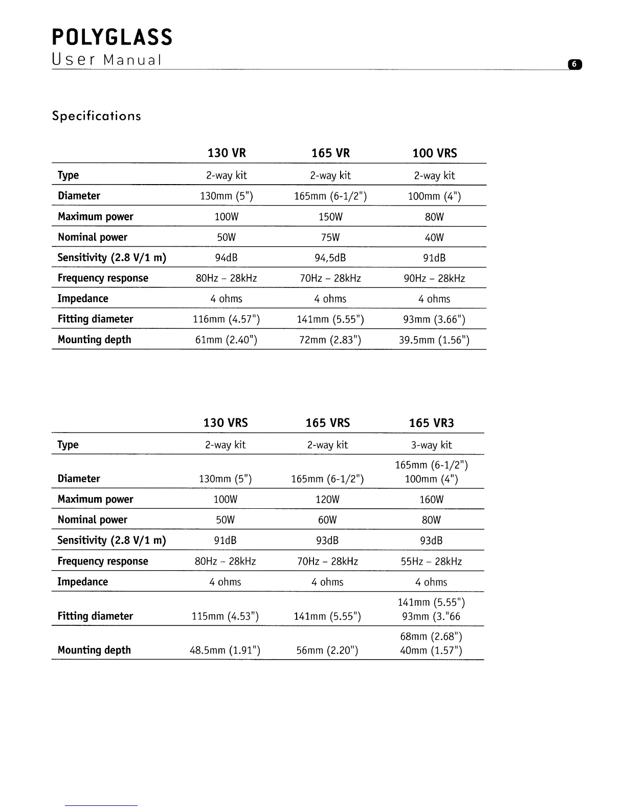 Focal Polyglass - Polyglass Speaker Specifications; Model-Specific Technical Data