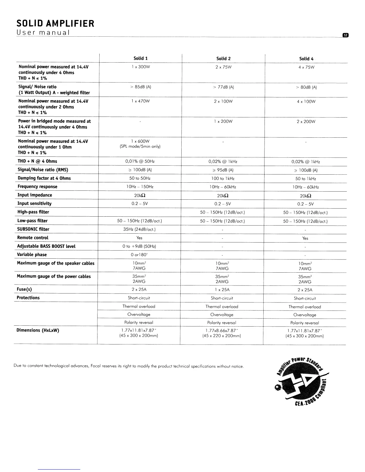 Focal Solid - Technical Specifications; Performance Data; Features and Dimensions