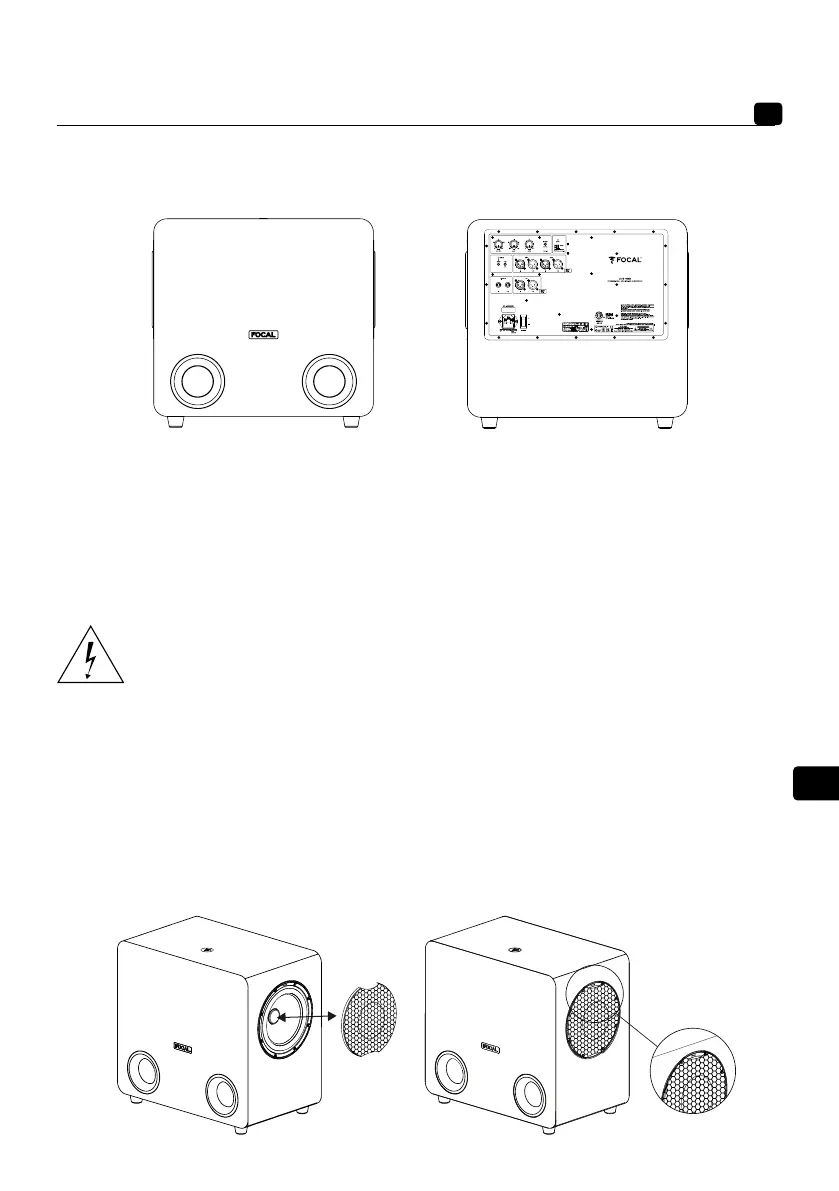 SUB ONE的两个扬声器各配有两个格栅。要插入格栅,请将格栅的槽口放在专用孔位前并逐步按下。拆