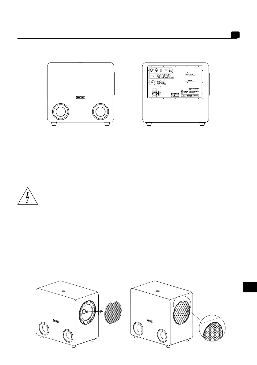 2개의 SUB ONE 스피커 각각에는 2개의 그릴이 장착되어 있습니다. 그릴을 삽입하려면 그릴의 홈을