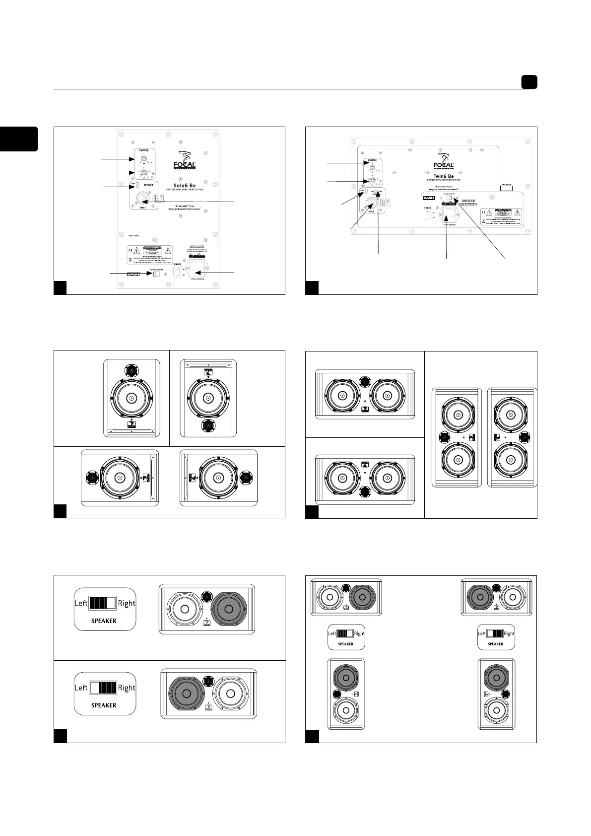 Focal Twin6 Be - Speaker Diagrams and Controls; Solo6 Be Rear Panel and Connections; Twin6 Be Rear Panel and Connections; Speaker Configuration Diagrams
