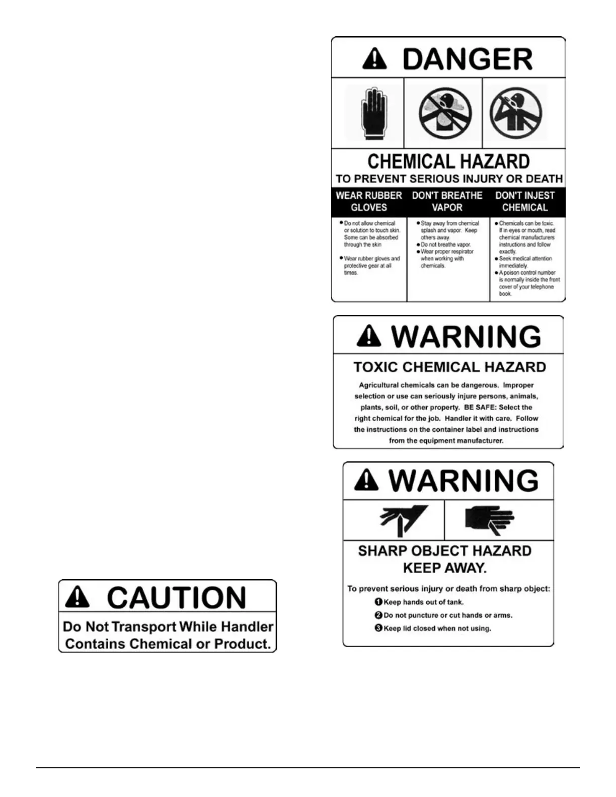 with the various safety decals, the type of warning and the area,