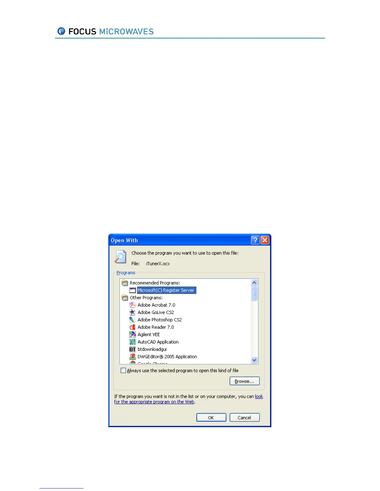 Using Windows Explorer double click on iTunerX.ocx. Windows should now prompt you to open