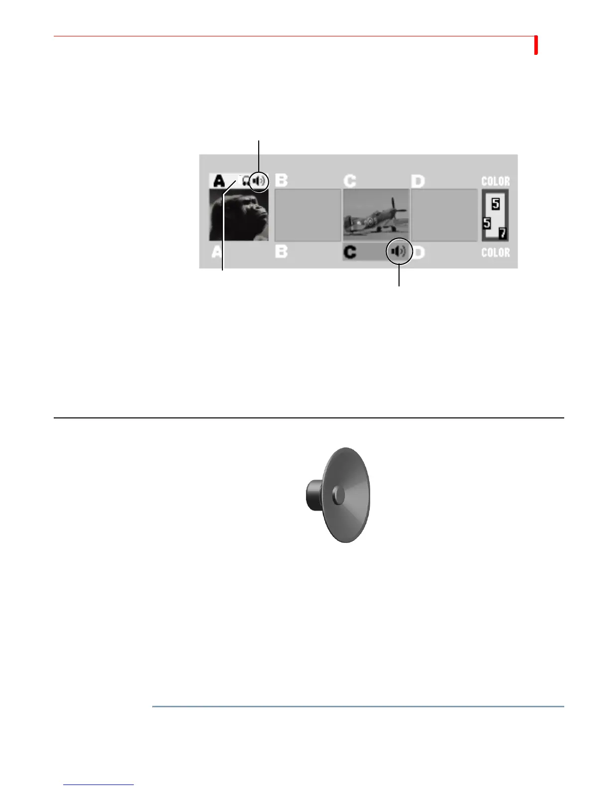 MX-4 highlights the NEXT video source in green (below the window). The speaker icon in this