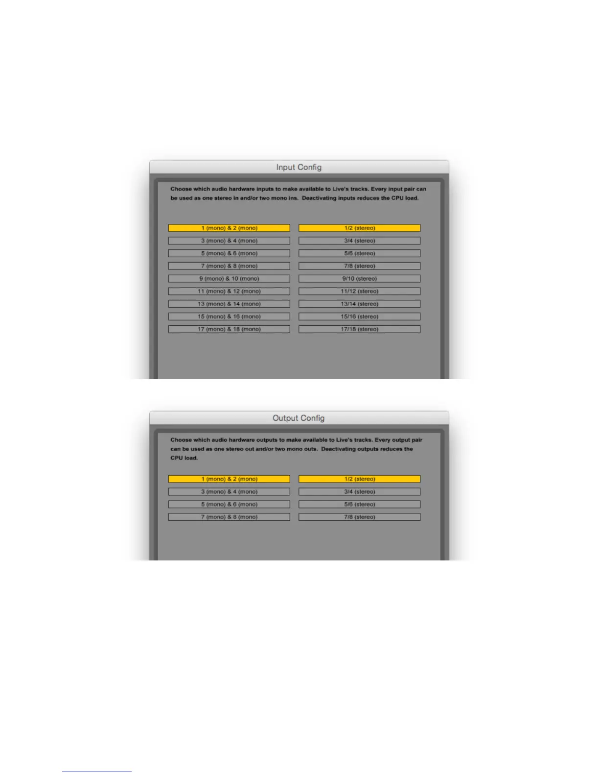 examples below show two inputs and two outputs enabled in Ableton Live Lite Audio Preferences.