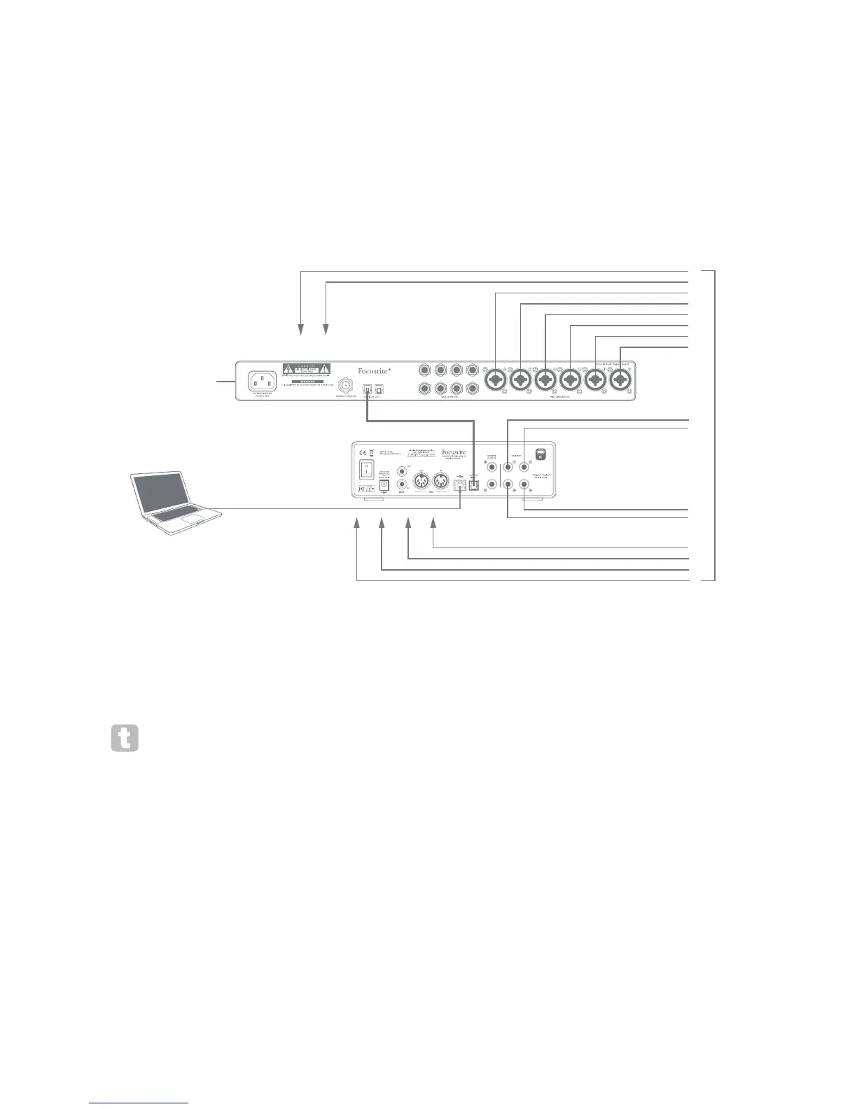 The OctoPre MkII’s ADAT output is connected to the Scarlett 18i8’s ADAT input with a single TOSLINK