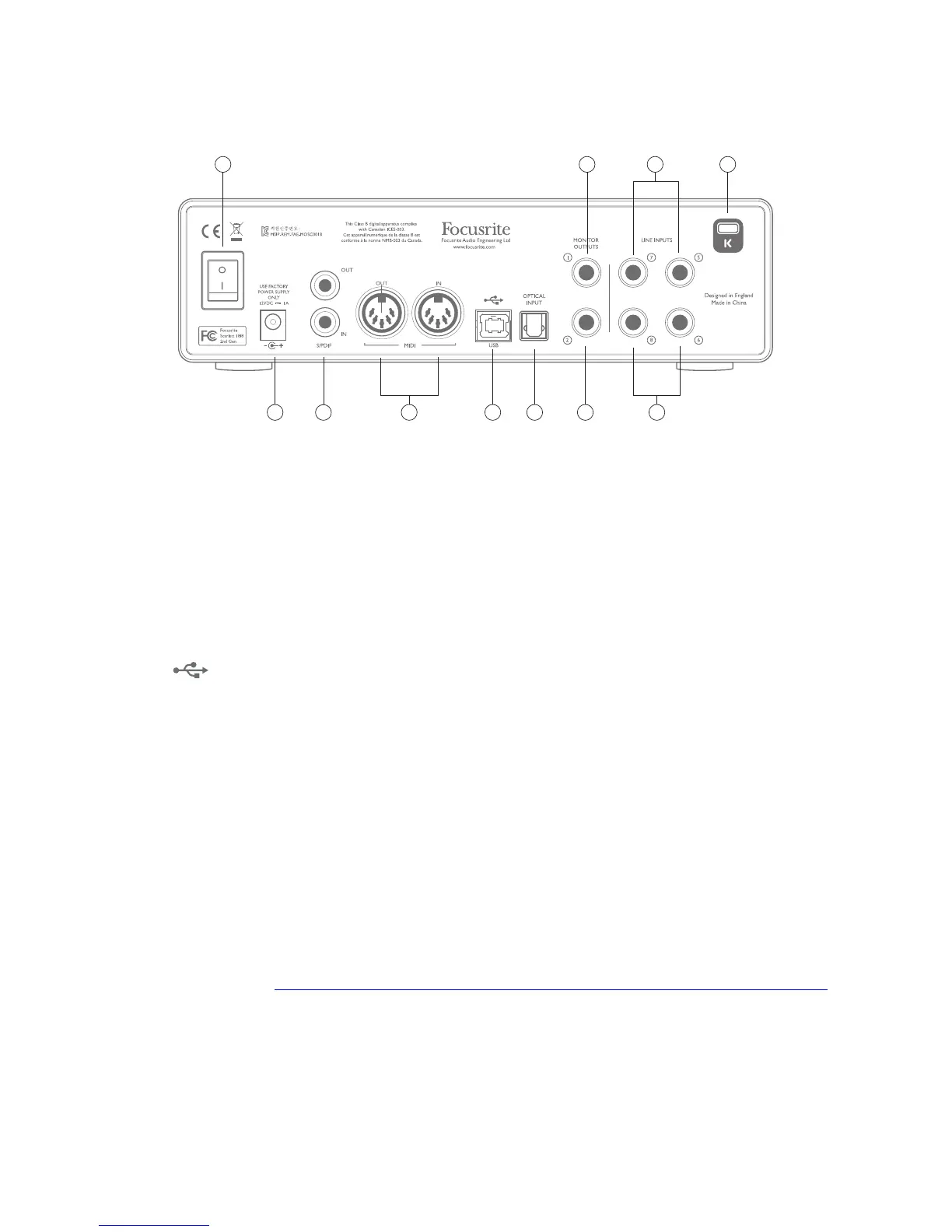 USB 2.0 port – Type B connector; connect the Scarlett 18i8 to your computer with the