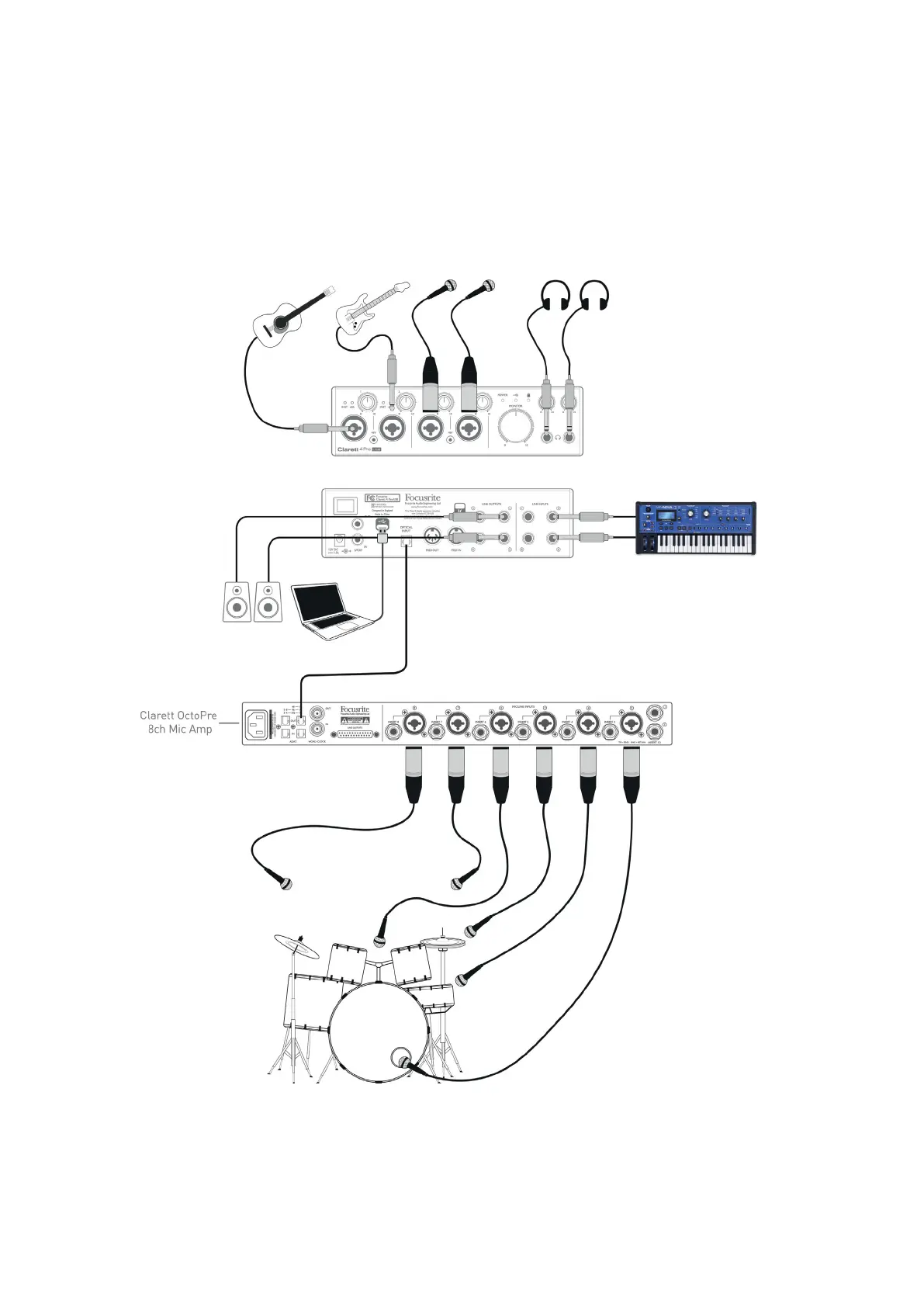 The Clarett OctoPre’s OPTICAL OUT port is connected to the Clarett 4Pre USB’s OPTICAL IN port