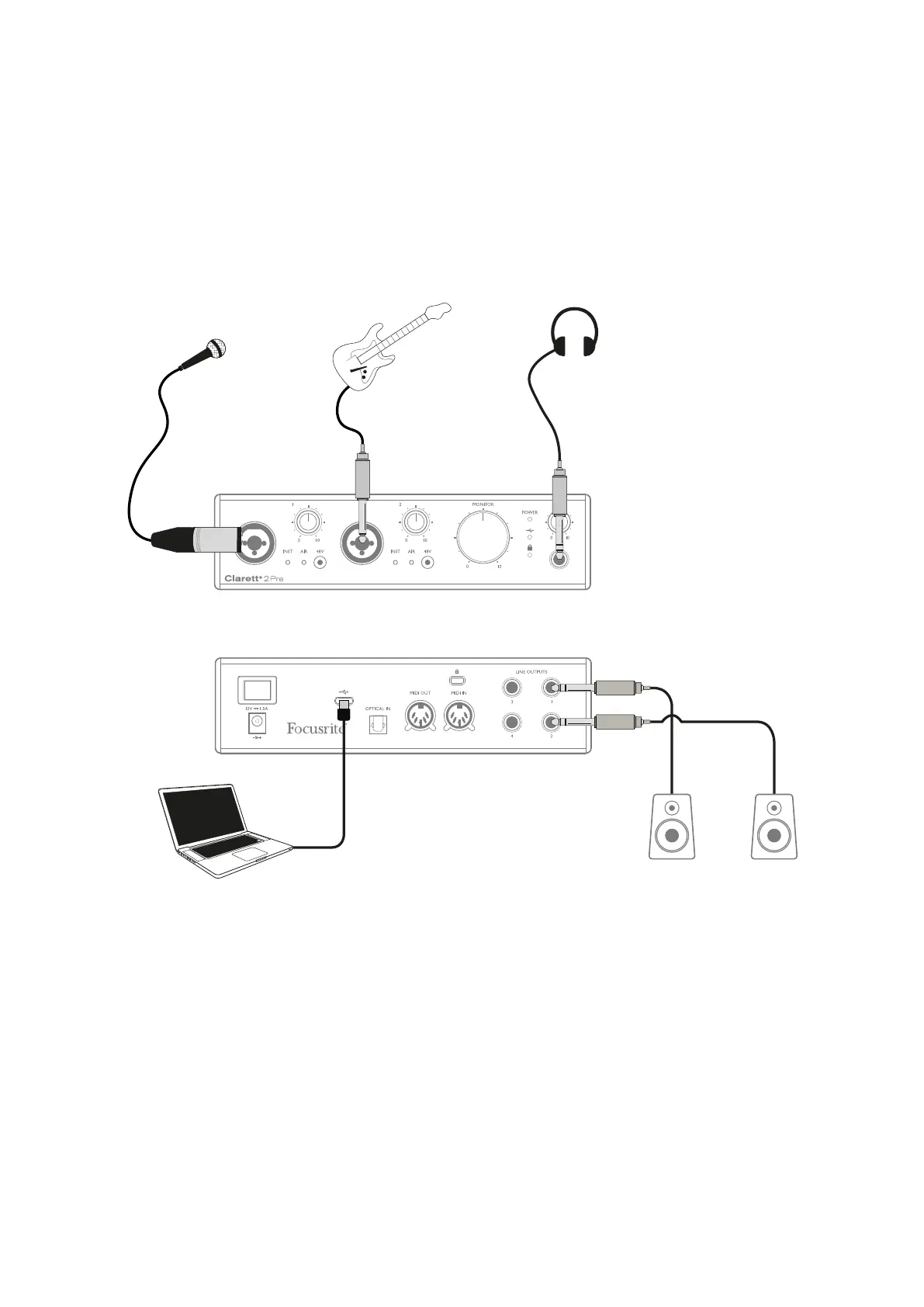 In this case, two sources – a microphone and a guitar – are connected to the Clarett+ 2Pre’s inputs.