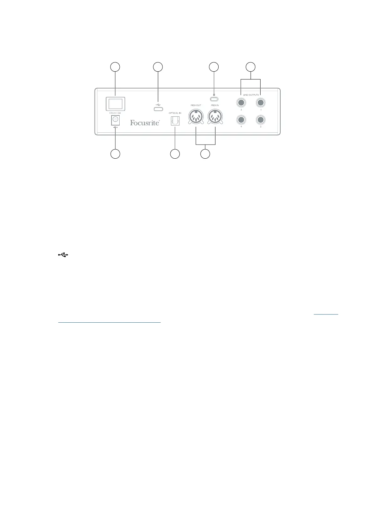 5. External DC power input – power the Clarett+ 2Pre via the separate AC adaptor (PSU) supplied.