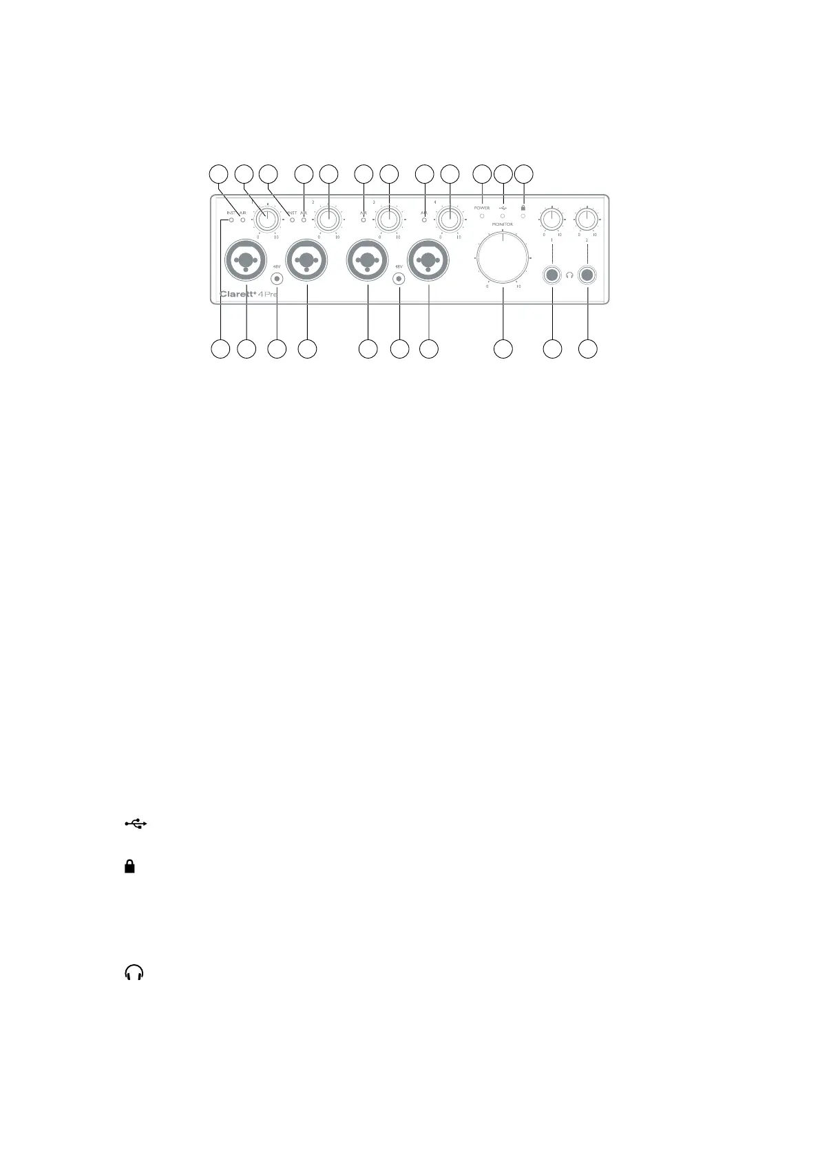 (Locked) – a green LED which confirms clock synchronisation, either to the Clarett+ 4Pre’s