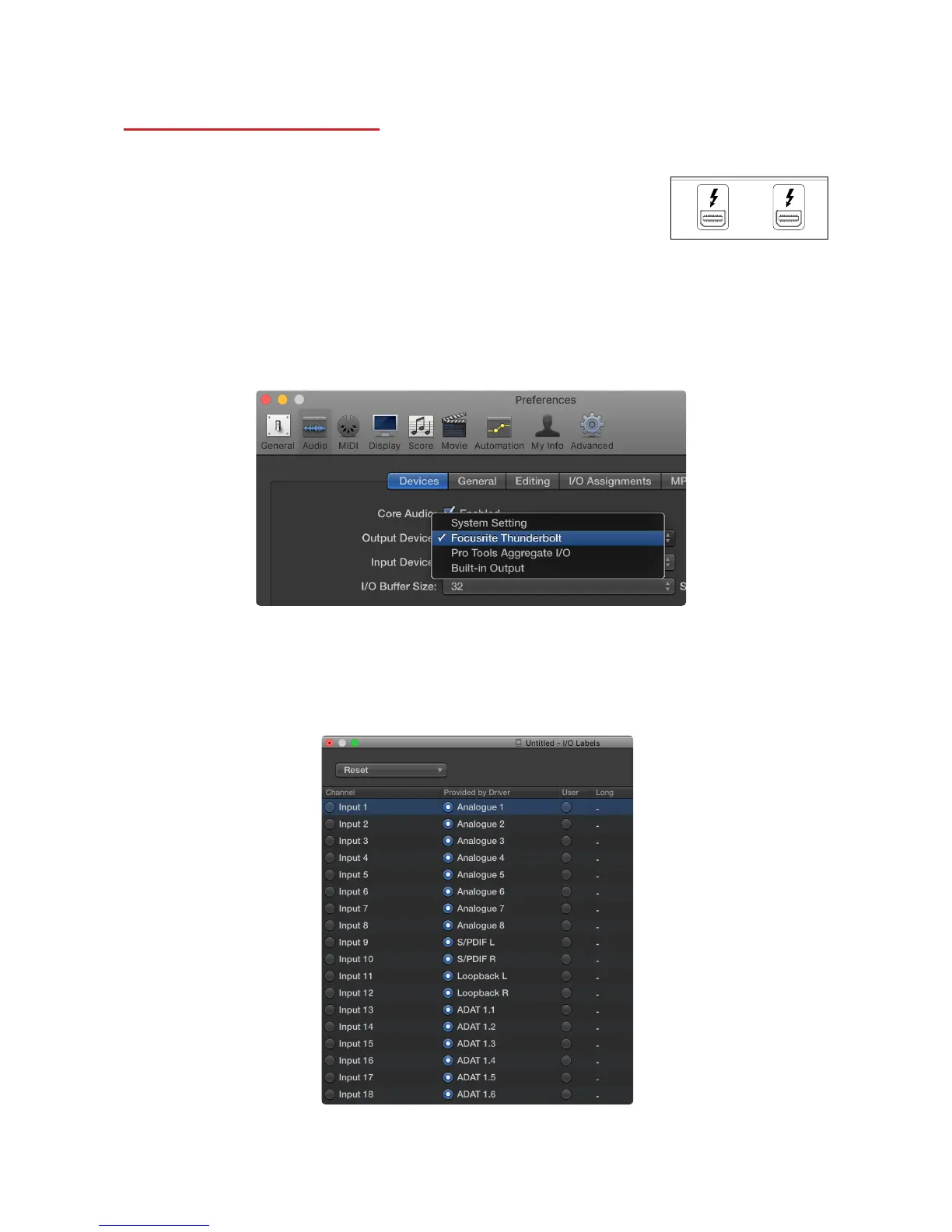 • Under the Devices tab, set: Input Devices and Output Devices to ‘Focusrite Thunderbolt’