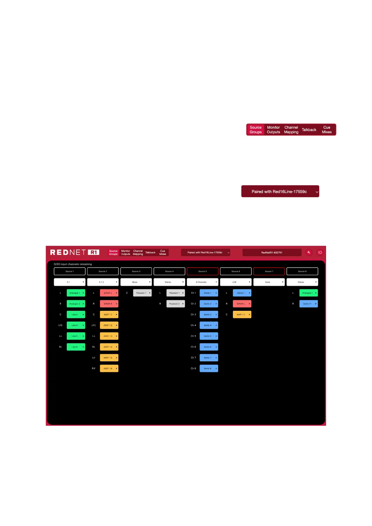 RedNet, Red and ISA range of interfaces. Graphical representation for each device shows: control