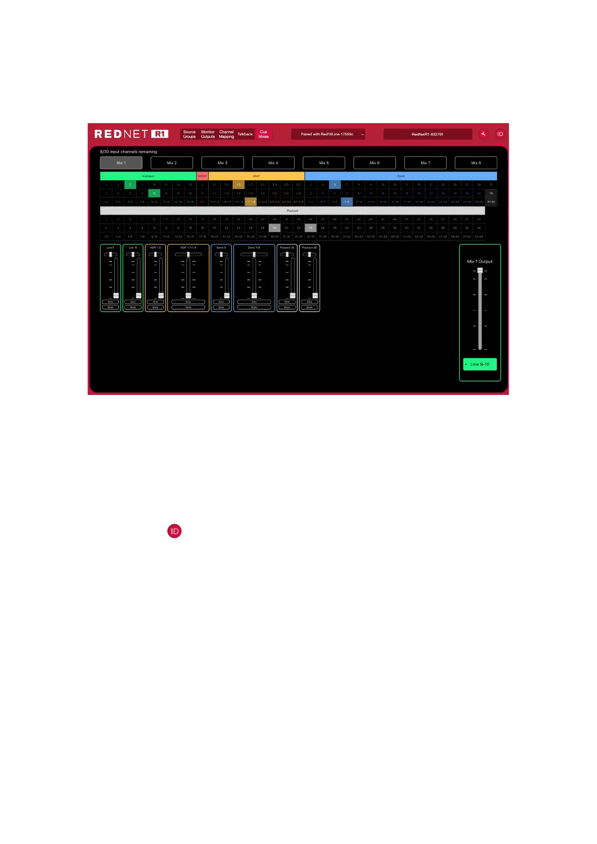 The Cue Mixes page shows the source, routing and level settings for each of the eight mix outputs.