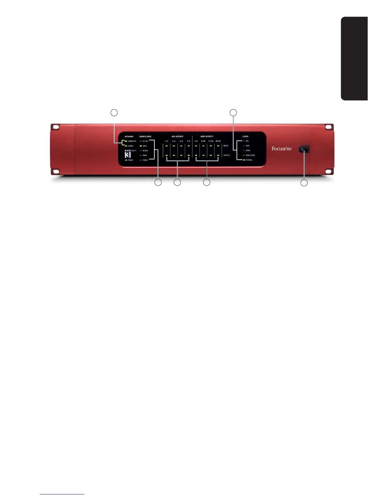 5. SAMPLE RATE indication – five yellow LEDs; only one of these (44.1 kHz, 48 kHz, 88.2 kHz,