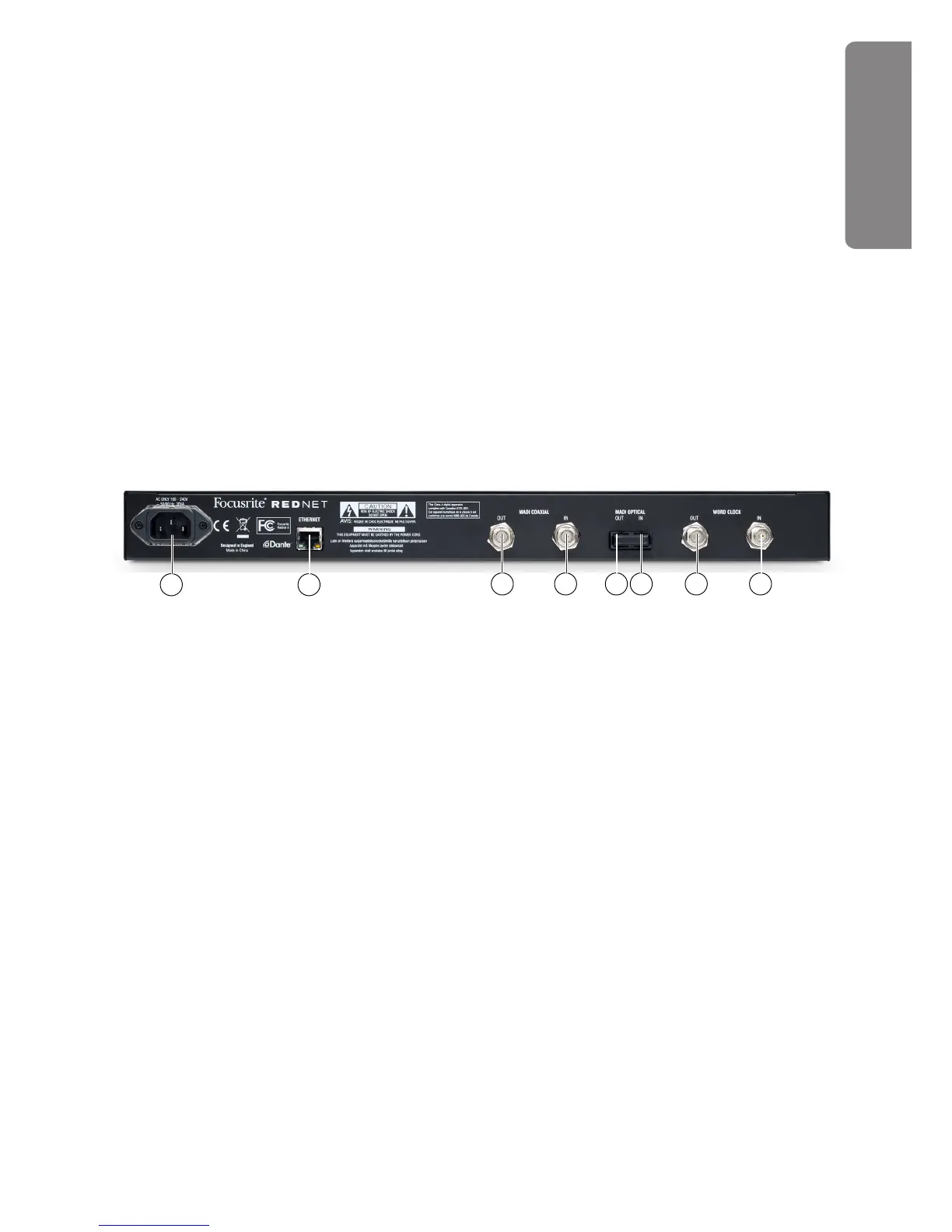 9. AC mains – standard IEC receptacle for connection of AC mains. RedNet 6 has a ‘Universal’