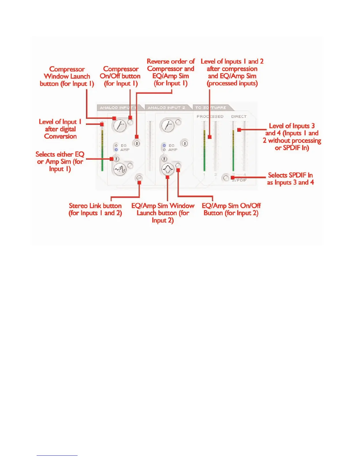 EQ or Amp Sim, as indicated by the LED and plug-in window launch icon.