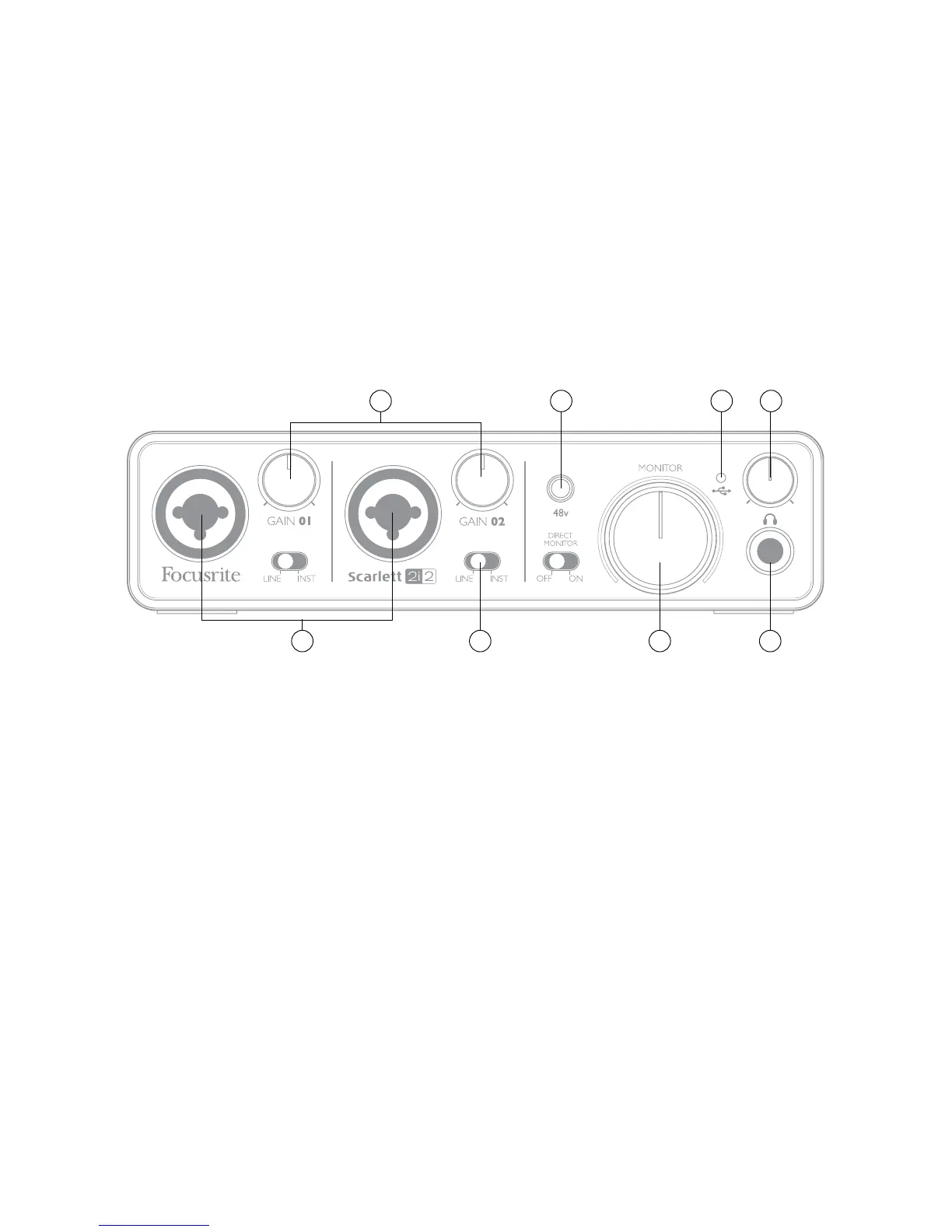 The Front Panel includes the input connectors for Mic, Line and Instrument signals, as well as
