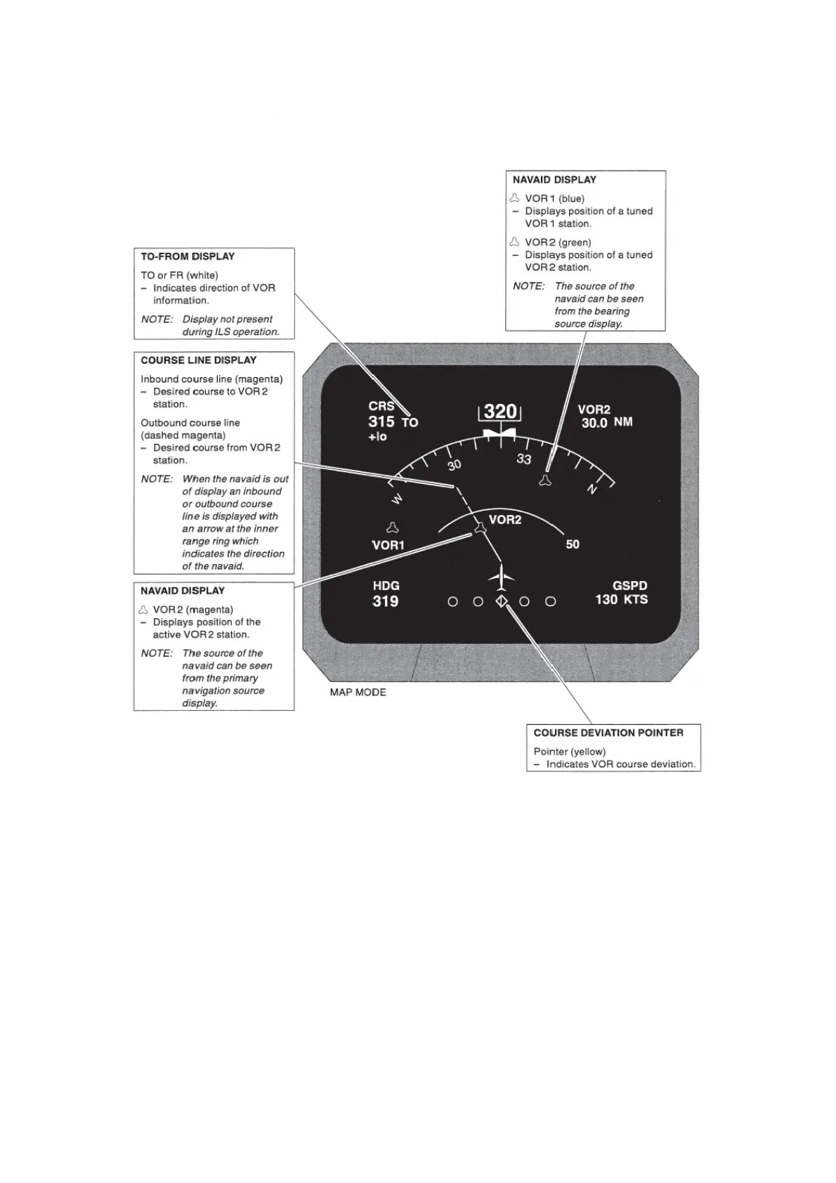 Fokker 50 - Navigation Display Navaid and Course Information; Navaid Display (VOR 1 and VOR 2); TO-FROM Display and Course Line; Course Deviation Pointer