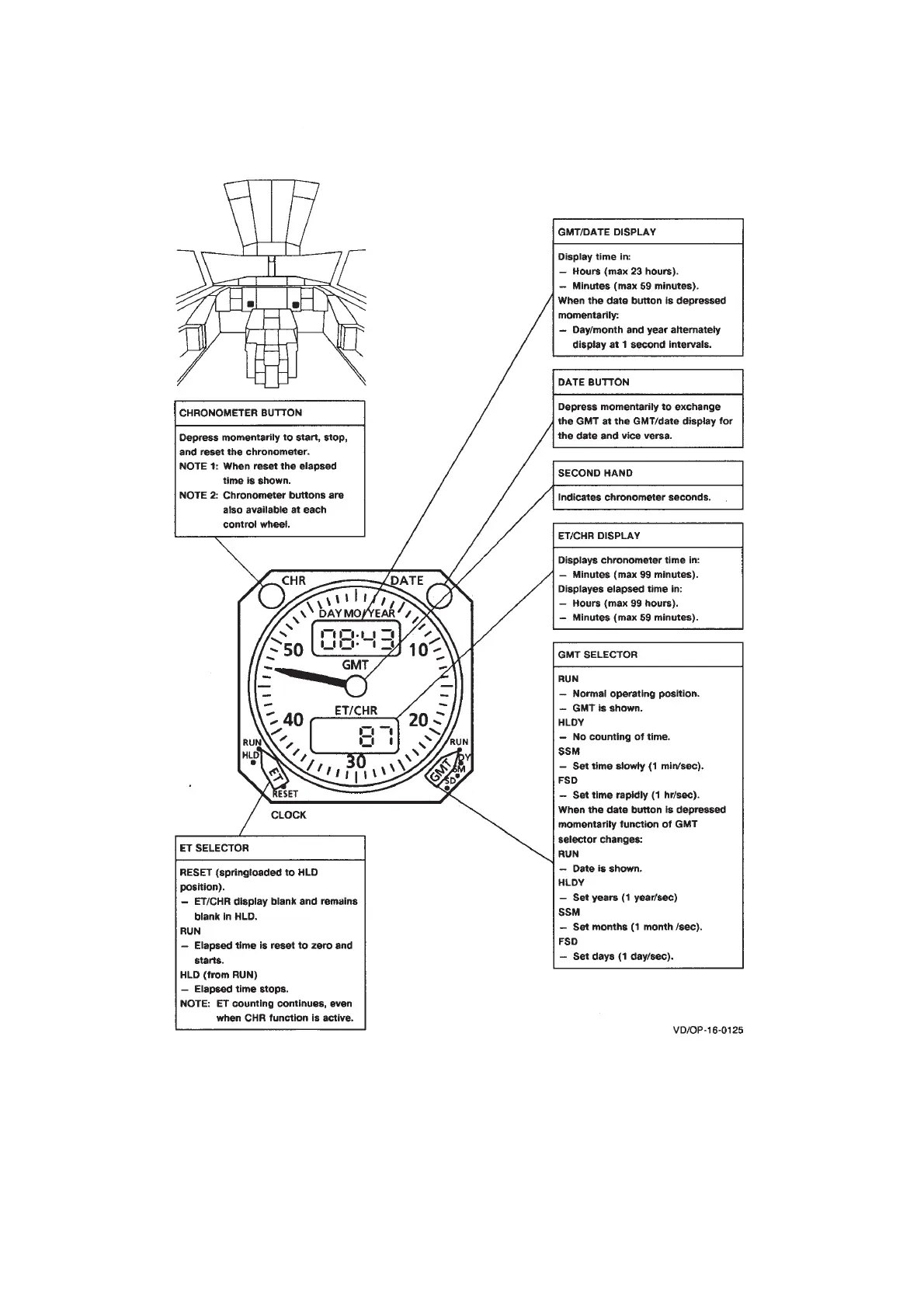 Fokker 50 - Clock Controls and Indicators (Type II); GMT;Date Display and Chronometer Buttons; Second Hand and ET;CHR Display; Clock, ET Selector, and GMT Selector