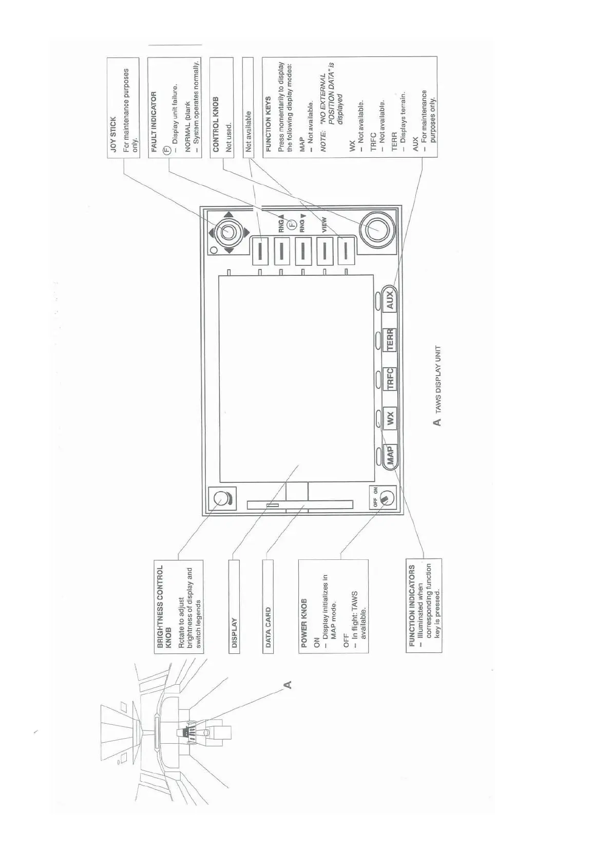 Fokker 50 - TAWS Display Unit Controls and Functions; Brightness Control Knob and Display; Data Card and Power Knob; Function Indicators and Joystick