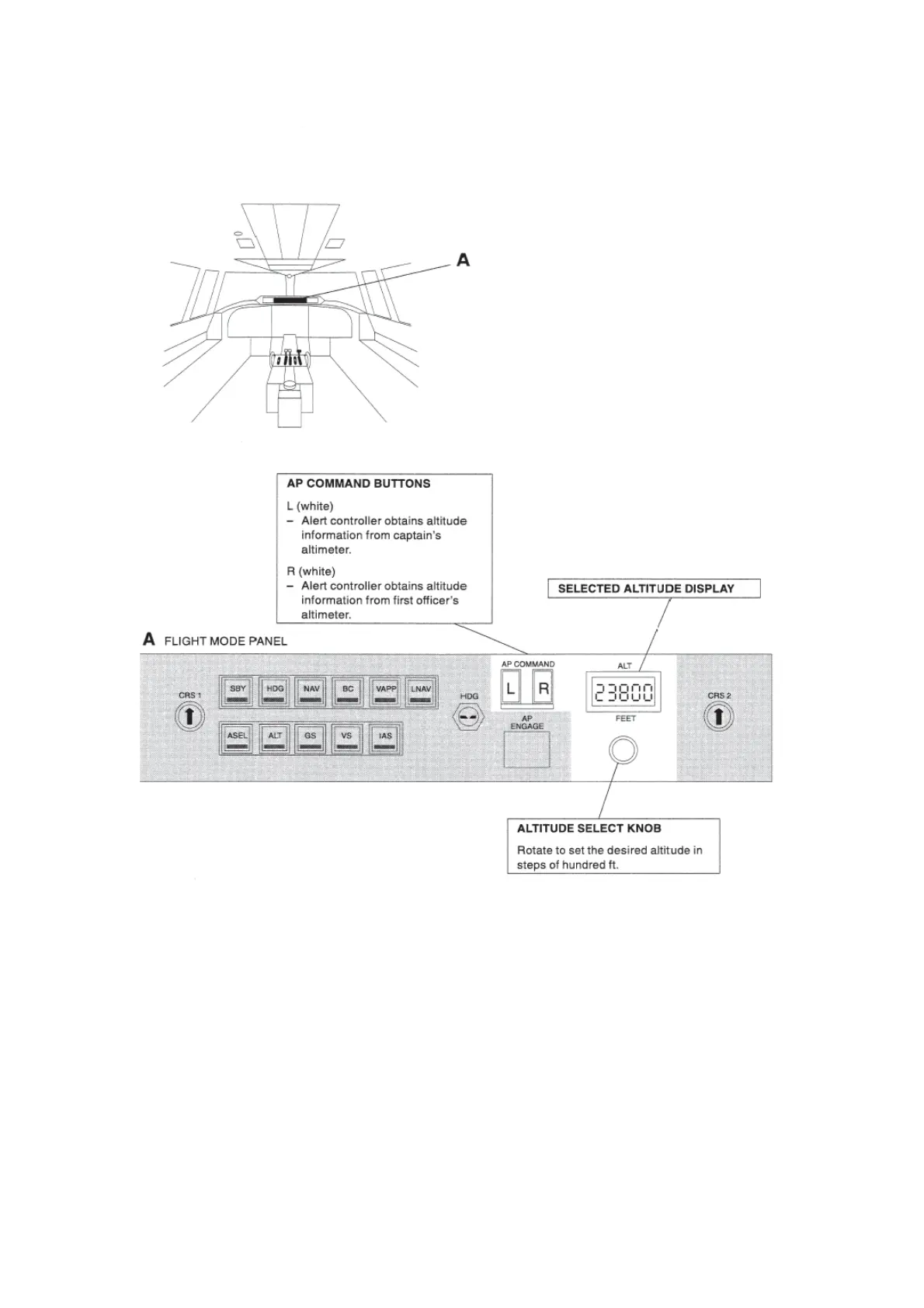 Fokker 50 - Flight Mode Panel and Altitude Select; Flight Mode Panel Overview; AP Command Buttons; Selected Altitude Display and Knob