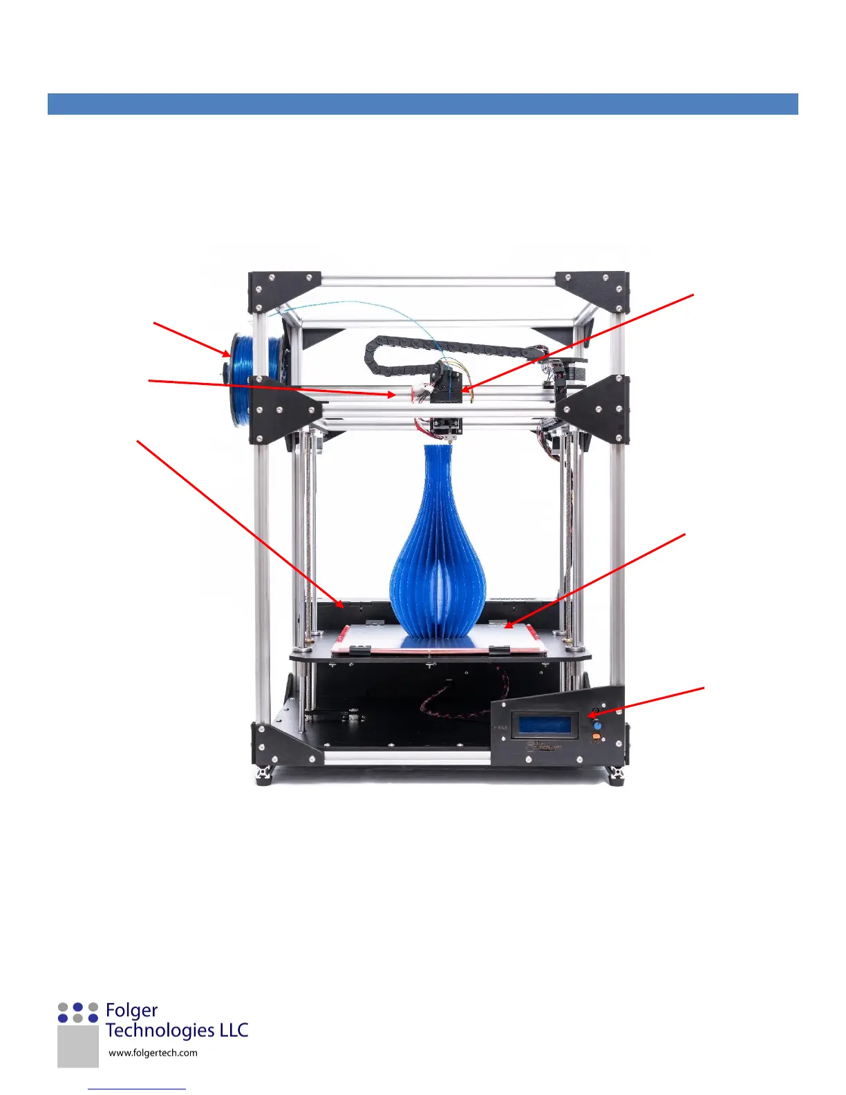 The figure below shows the features of the Folger Tech FT-5 3D printer. You can reference this graphic for clarification of printer
