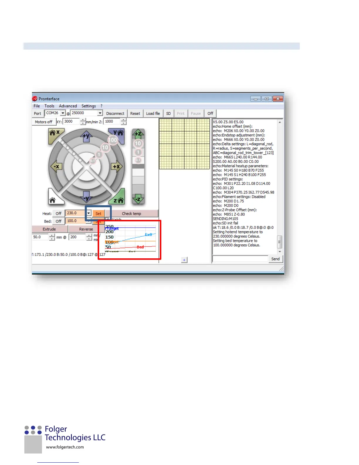 set button. Watch the graph to make sure the temperature of the hot end is heating up and holds steady around
