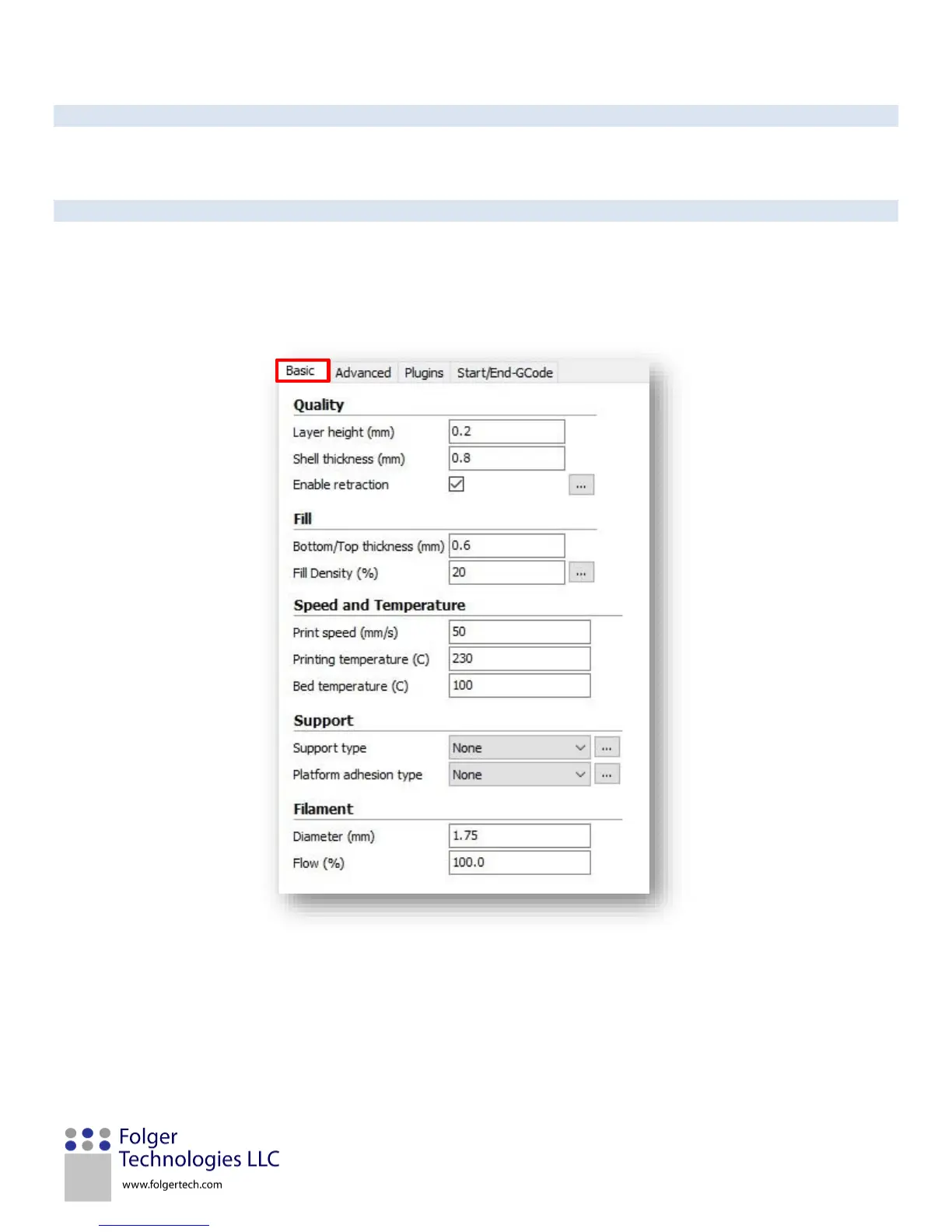Setting tab in Cura. The figure below shows the typical Basic tab settings for most prints. A detailed explanation of each