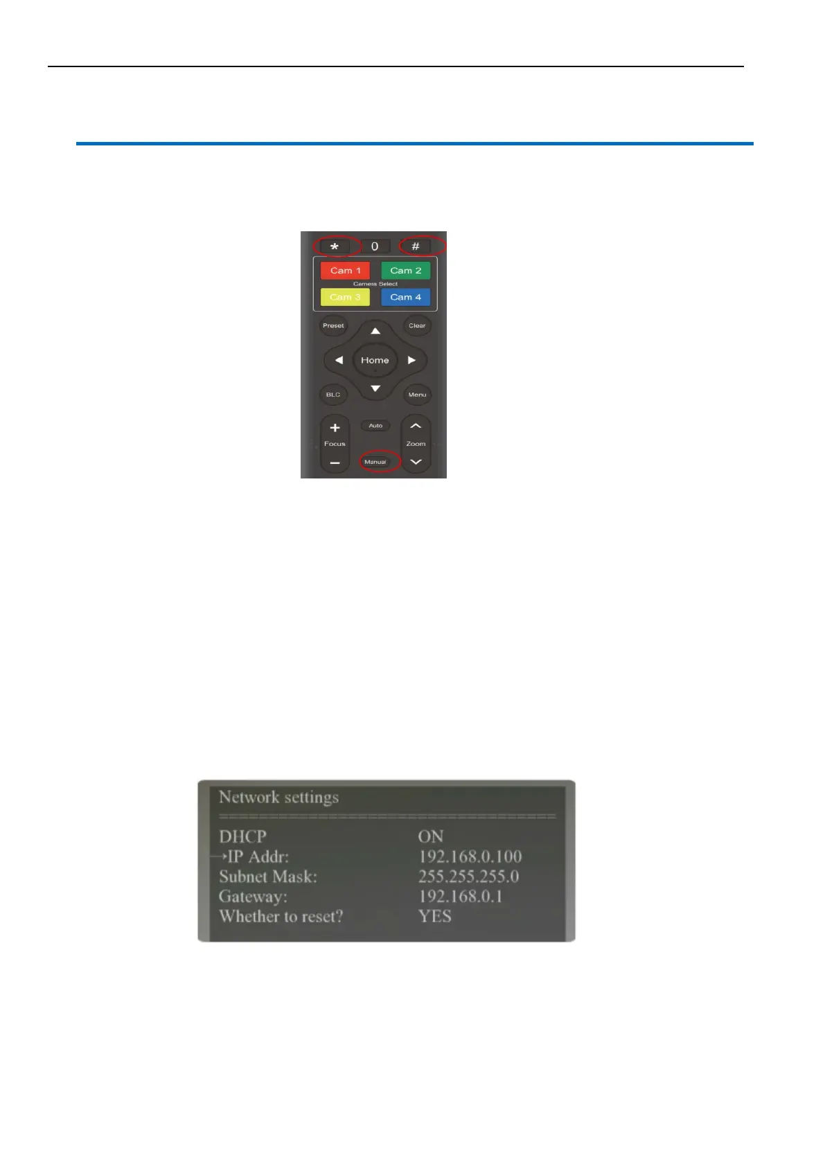 Step 4: Go to camera’s menu by press “menu” button on remote control -> Network-> IP Addr.