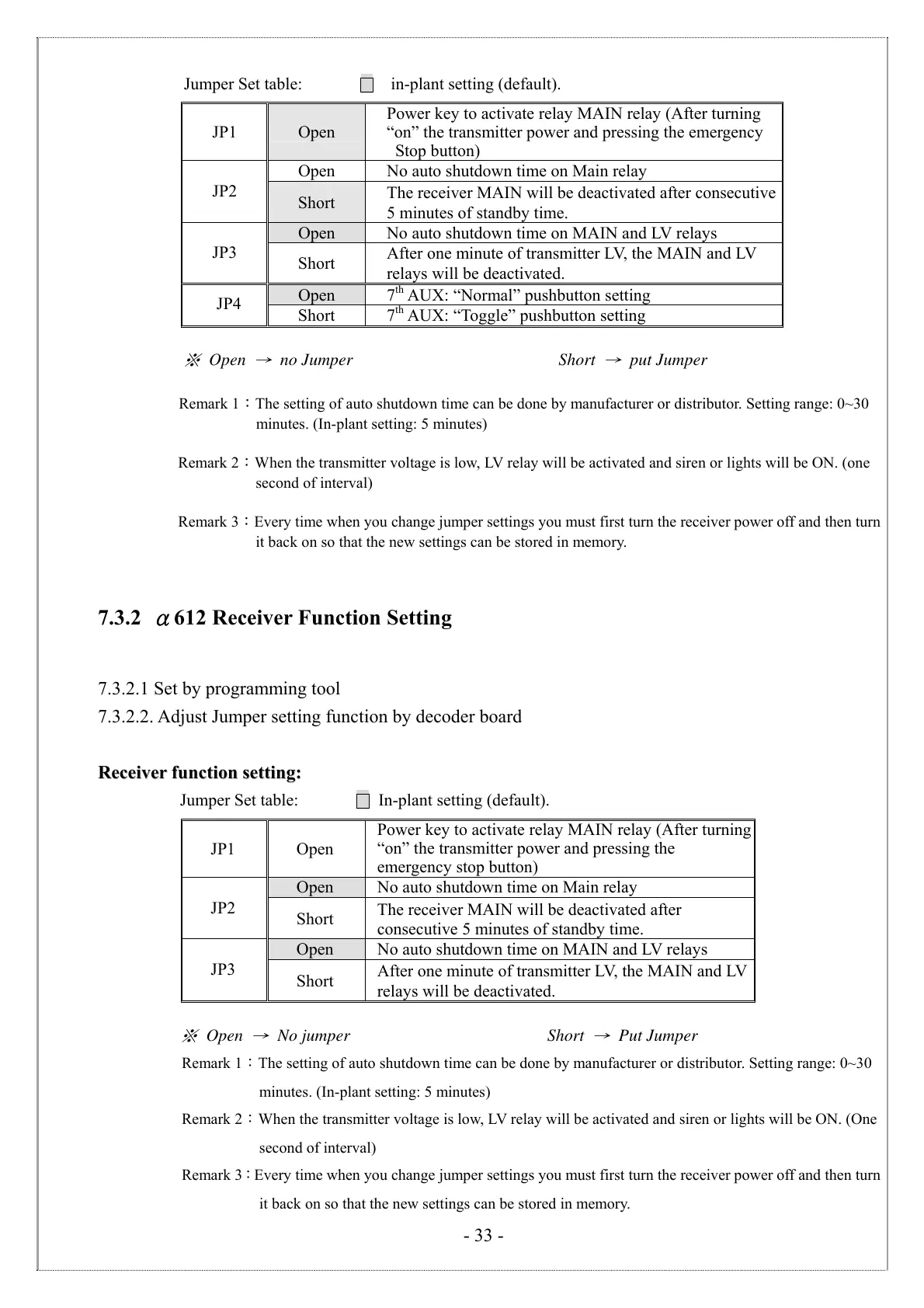 Remark 3:Every time when you change jumper settings you must first turn the receiver power off and then turn