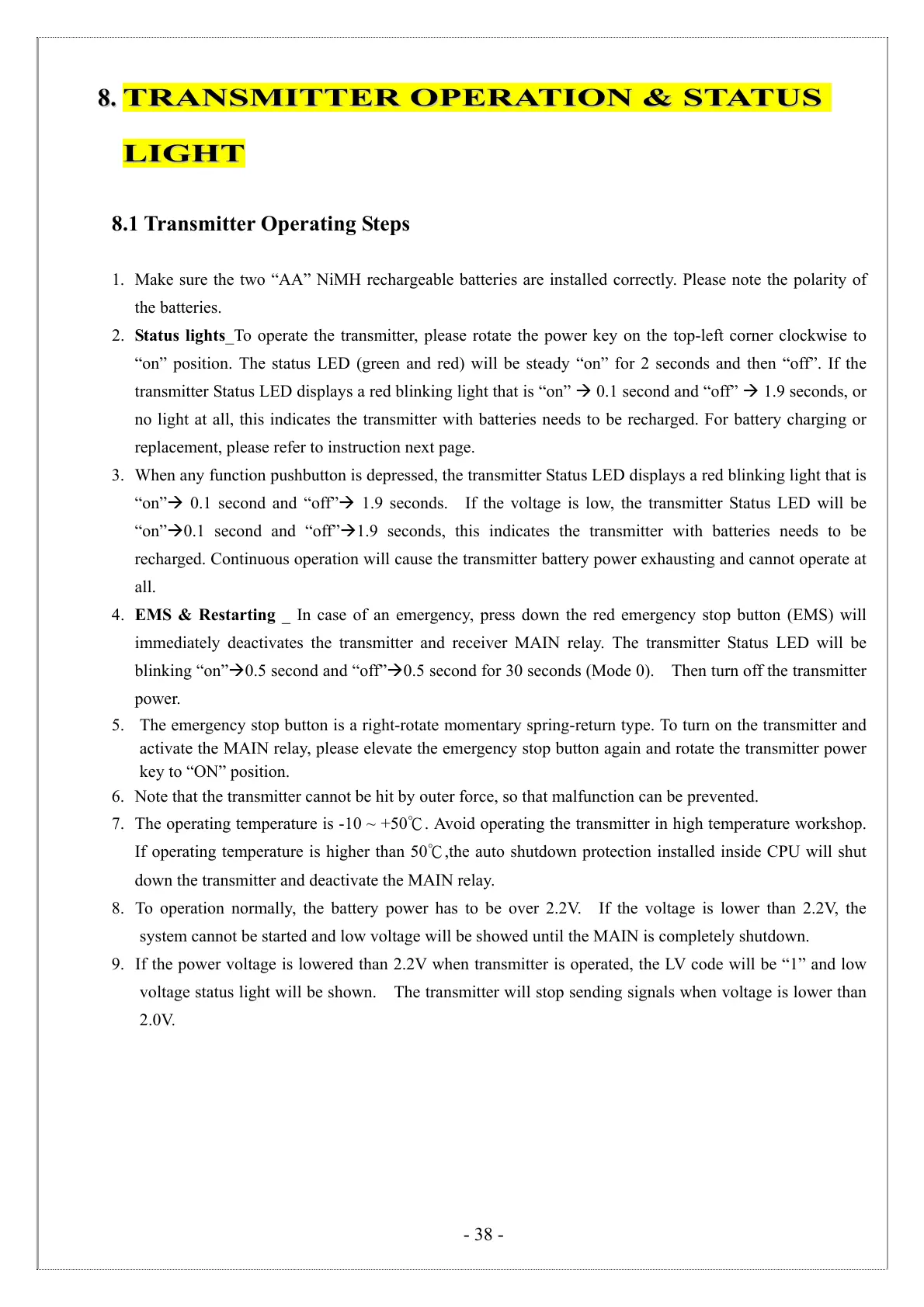 voltage status light will be shown. The transmitter will stop sending signals when voltage is lower than