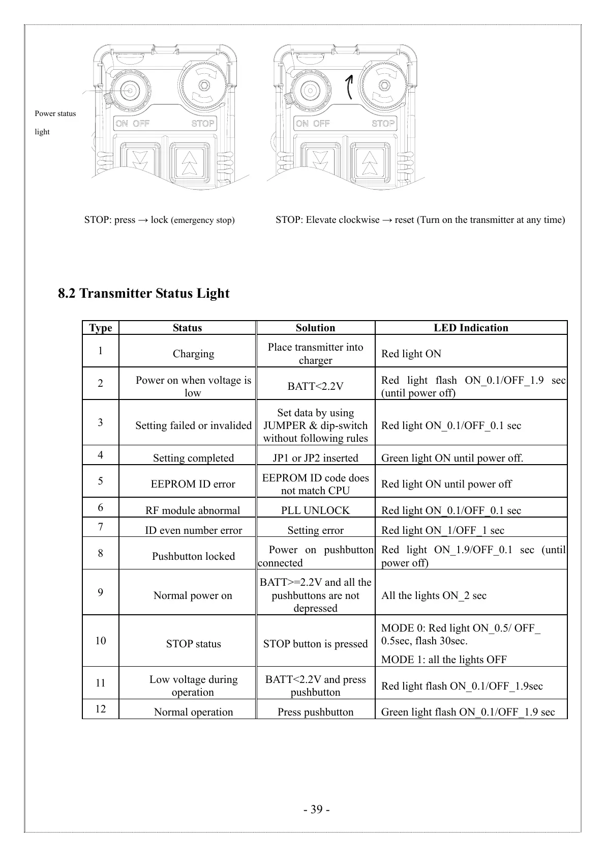 STOP: press → lock (emergency stop) STOP: Elevate clockwise → reset (Turn on the transmitter at any time)