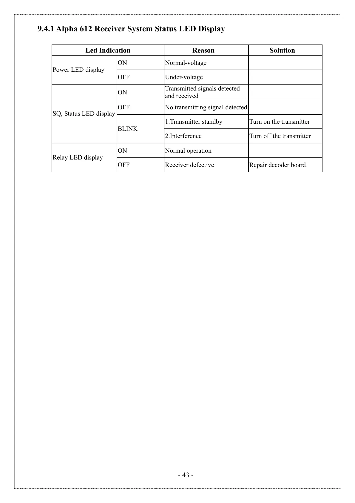 9.4.1 Alpha 612 Receiver System Status LED Display