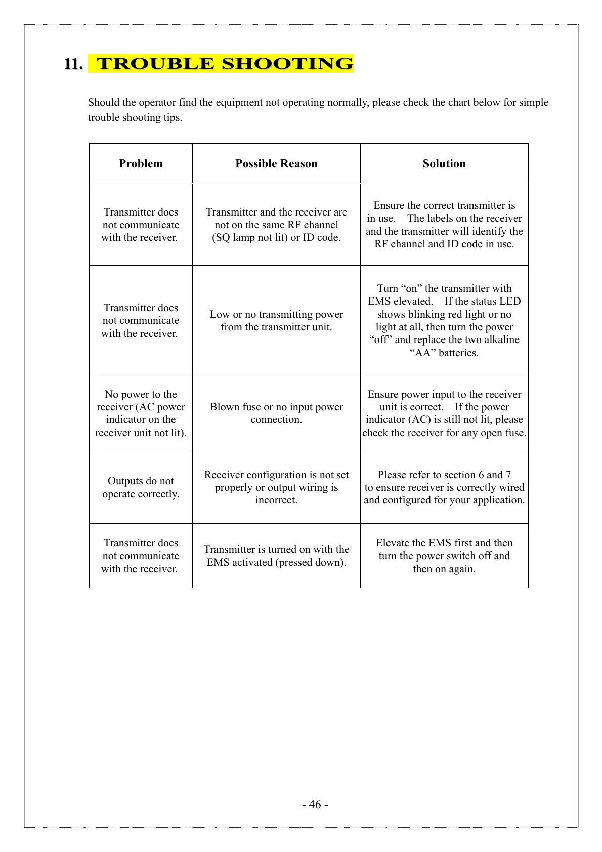 Should the operator find the equipment not operating normally, please check the chart below for simple
